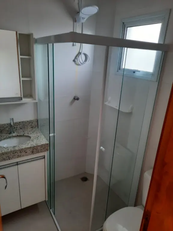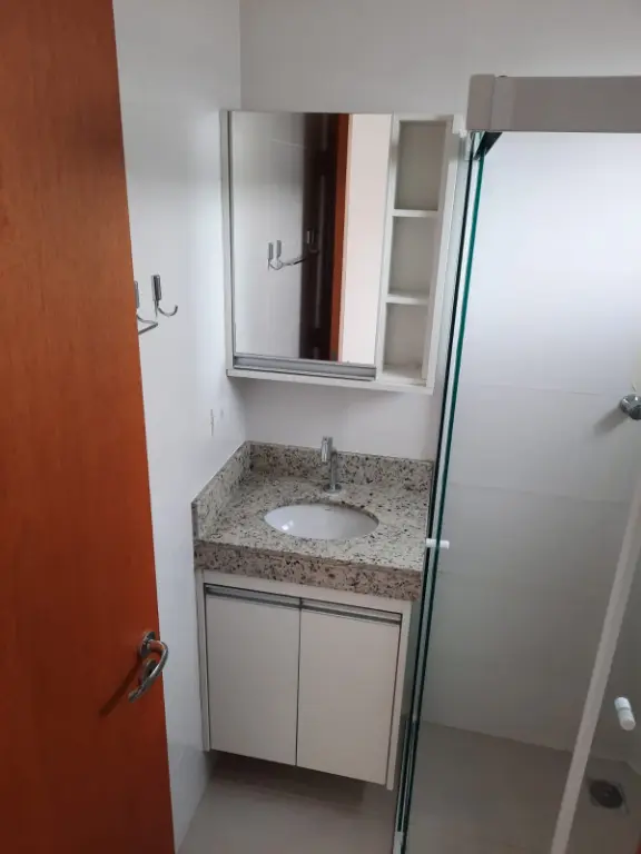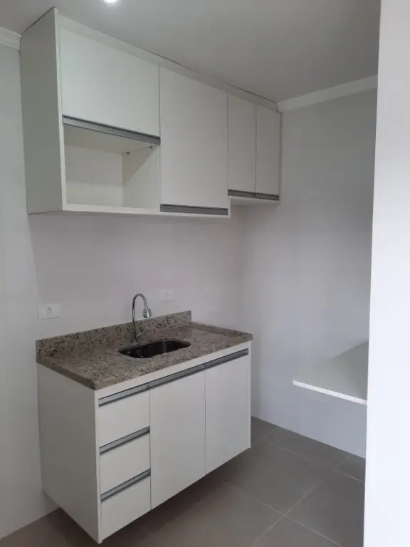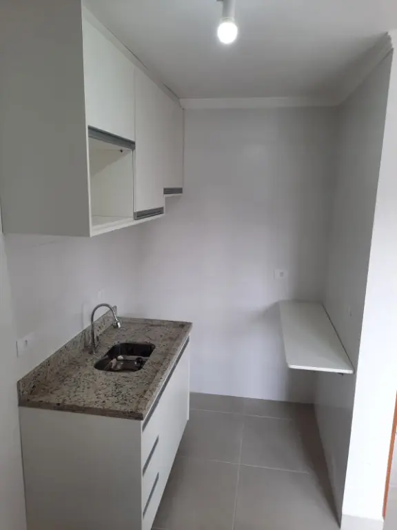 O apartamento está no primeiro andar de um condomínio tranquilo, com elevador. Possui cozinha com armários planejados e banheiro já com box e espelho instalados.