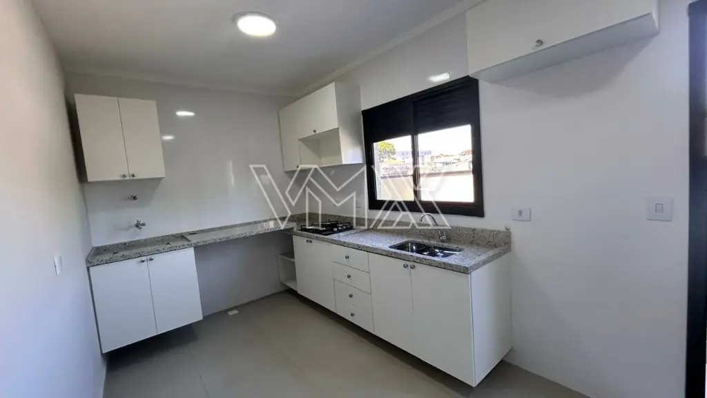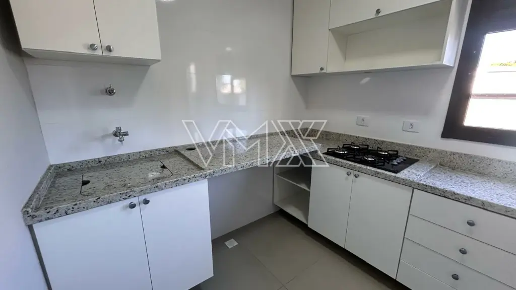 Cozinha equipada com armários planejados, fogão e cooktop