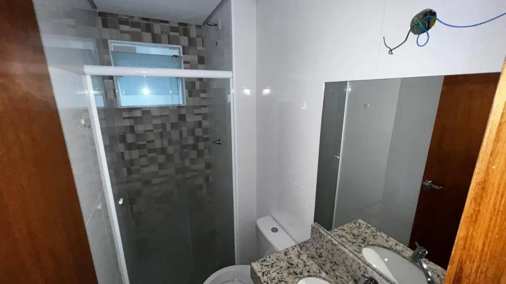 Banheiro com gabinete e box de vidro