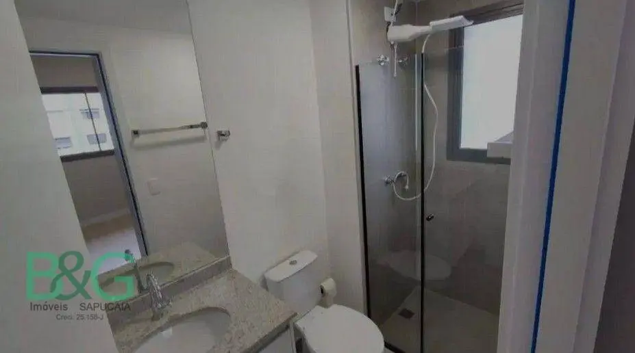Banheiro completo, com gabinete, espelho, box de vidro temperado e janela externa, garantindo ventilação natural