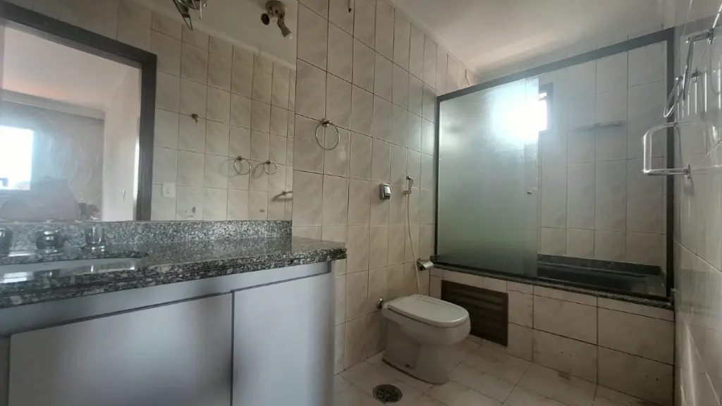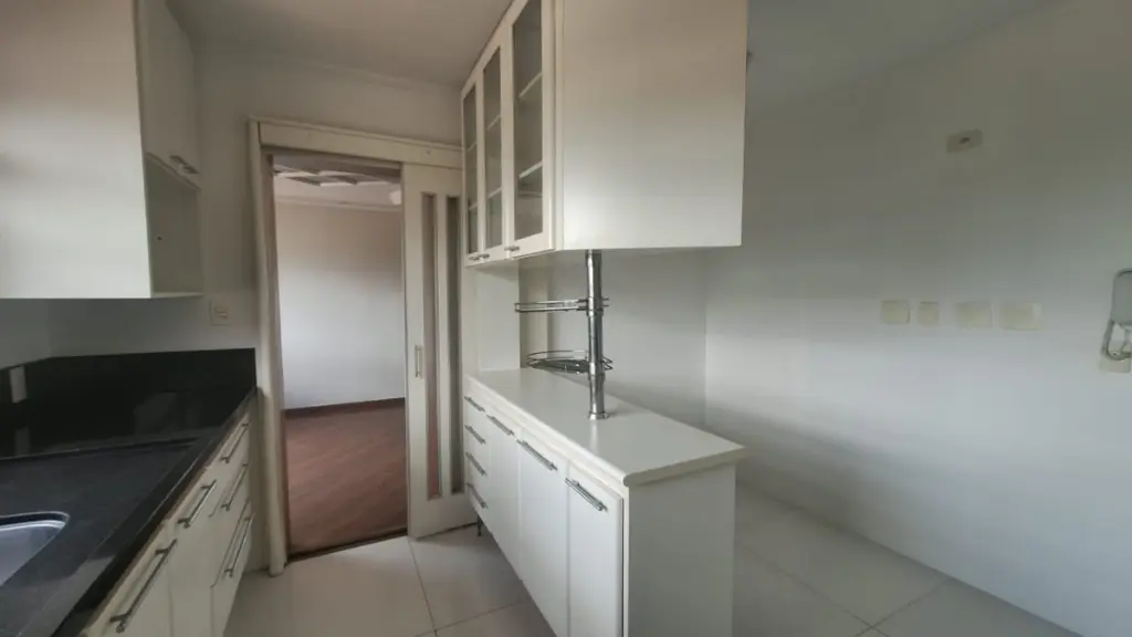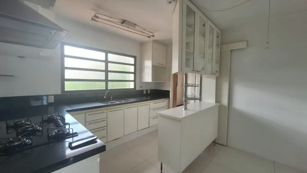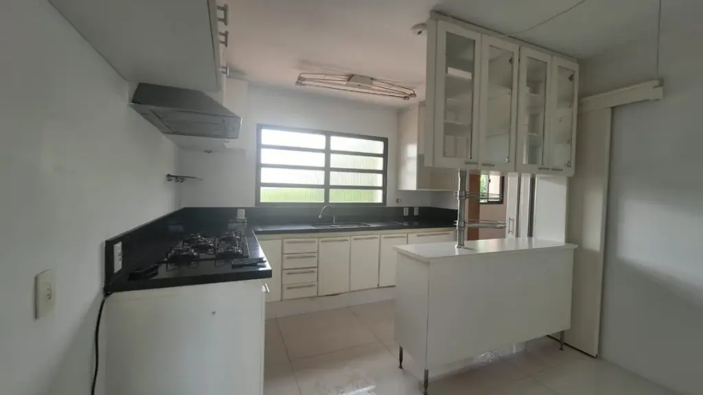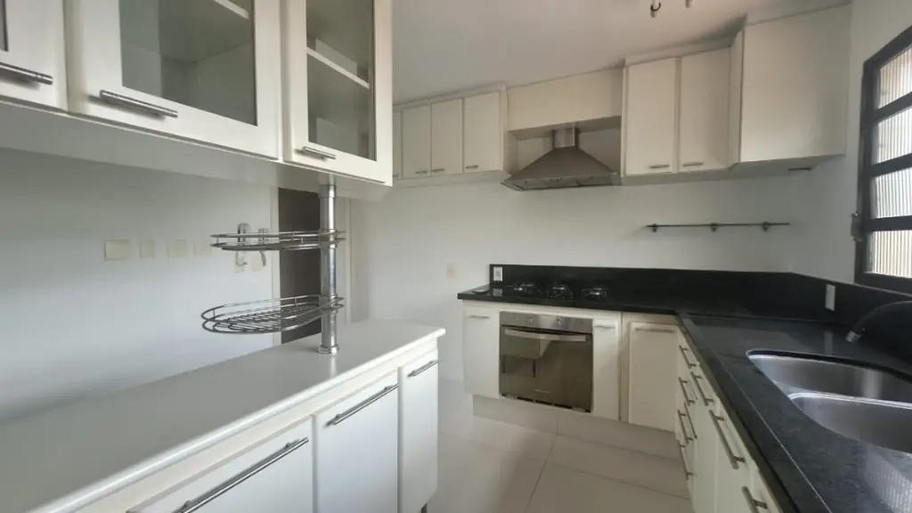A cozinha é espaçosa e funcional, com armários planejados, além de uma copa que traz praticidade para o dia a dia. Conta ainda com área de serviço completa, incluindo quarto e banheiro de apoio.