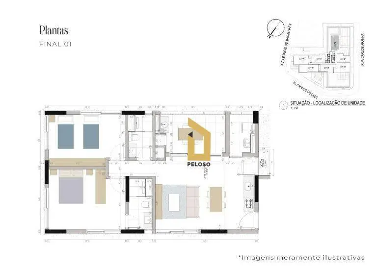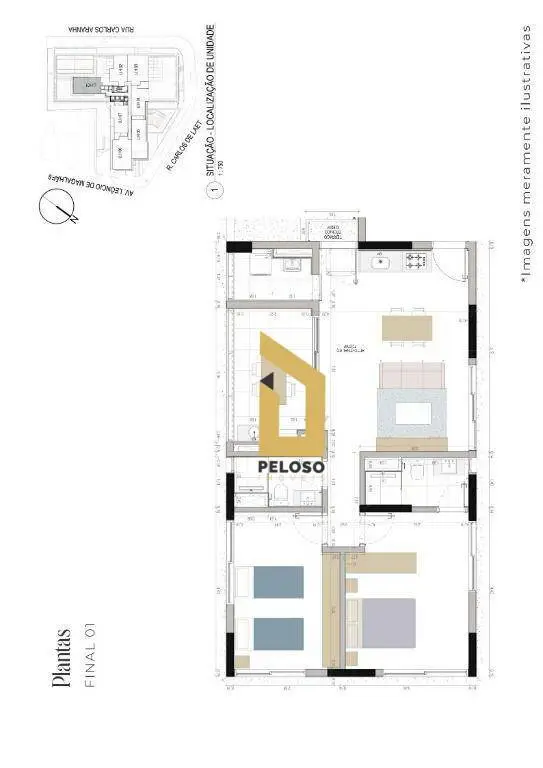 2 dormitórios sendo 1 suíte, sala para 2 ambientes, cozinha, área e serviço.