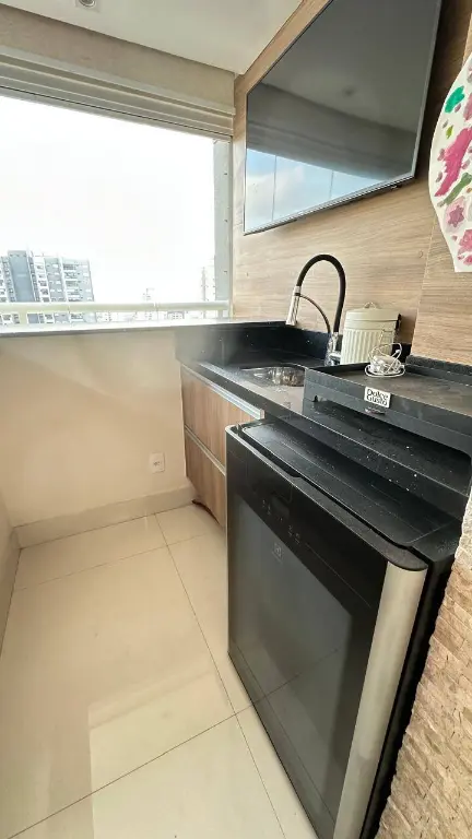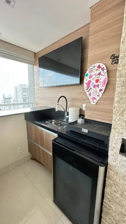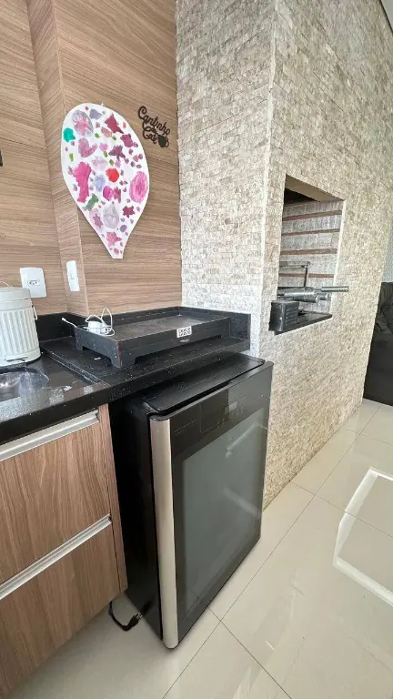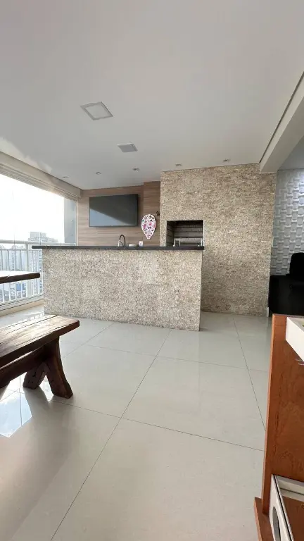 Varanda Gourmet Integrada: Um convite ao lazer! Ampla, com fechamento em vidro em toda a extensão, perfeita para momentos de confraternização, desfrutando da linda vista. Linda mesa de madeira maciça. Ampla bancada, com cervejeira e TV.