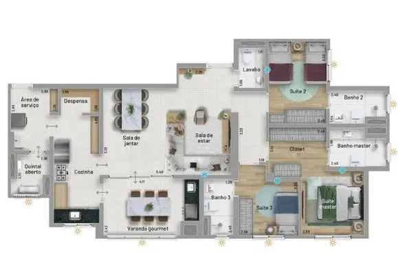 Apartamento de 117m², no 23º andar, com 3 suítes, lavabo, 2 vagas de garagem de carro, depósito e uma padrão com carregamento elétrico, varanda com churrasqueira a carvão integrada à sala e à cozinha, piso da varanda nivelado com o da sala, piso porcelanato nas áreas comuns e vinílico nas suítes, aquecedor a gás, infraestrutura para instalação de ar condicionado, fechaduras biométricas e com senha nas portas social e de serviço.