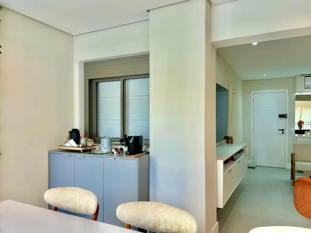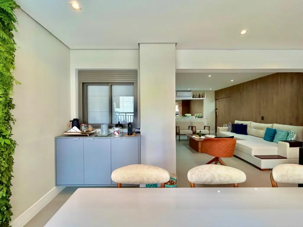 O apartamento possui 112 m² muito bem distribuídos, com acabamentos diferenciados e espaços amplos. Conta com living para dois ambientes, varanda gourmet integrada com churrasqueira a carvão, lavabo, 3 dormitórios, todos suítes, cozinha planejada e 2 vagas de garagem.