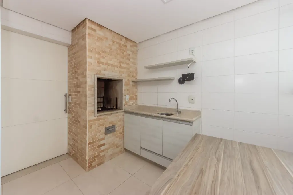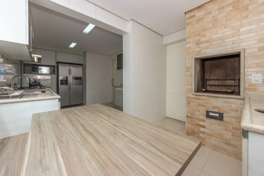 O grande destaque fica para a cozinha gourmet com churrasqueira instalada dentro do apartamento, perfeita para reunir amigos e família sem sair de casa. Ela já está equipada com eletrodomésticos, pronta para uso.