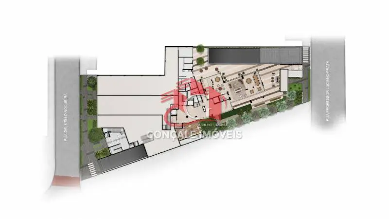 Térreo: Brinquedoteca, salão de festas, Lounge externo do Salão de festas, espaço Gourmet, longe externo do espaço gourmet, praça das Jabuticabeiras.