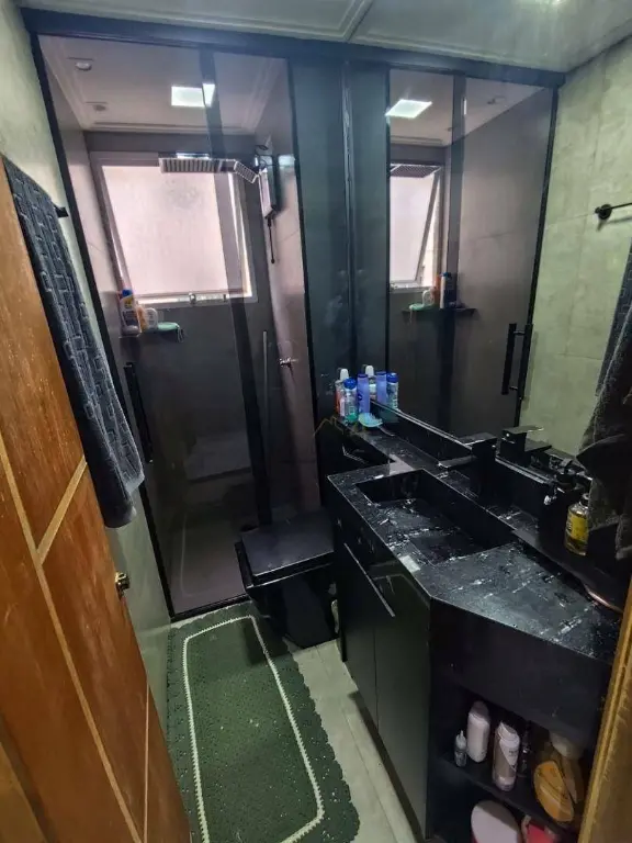 Banheiro com box de vidro e armário