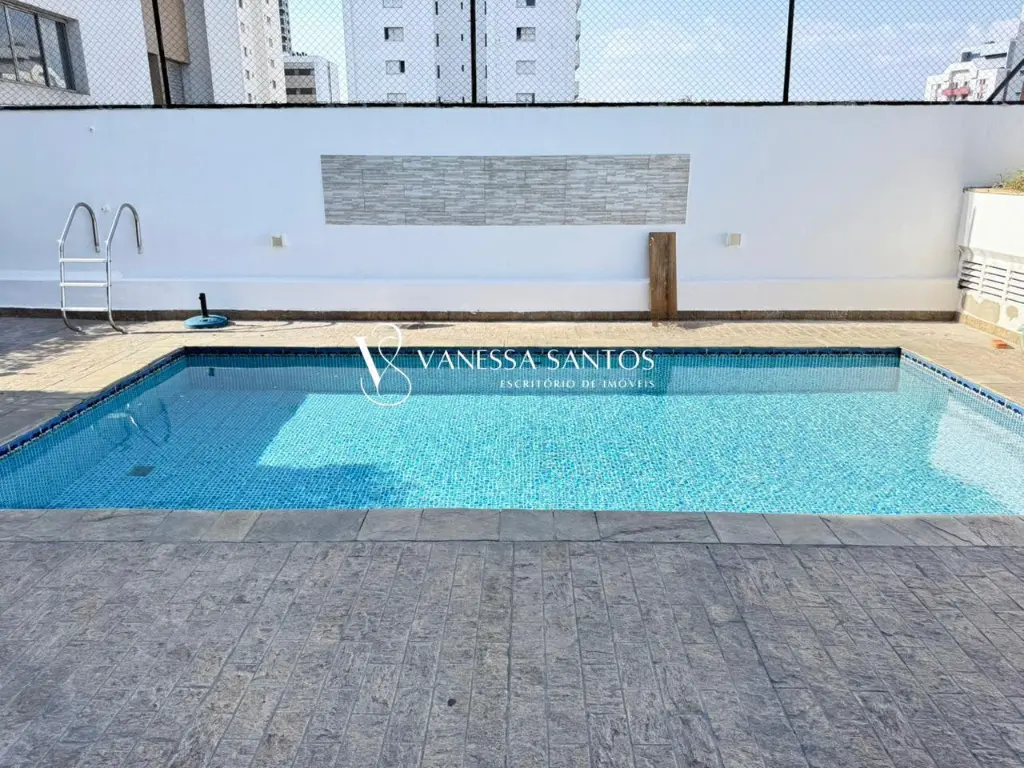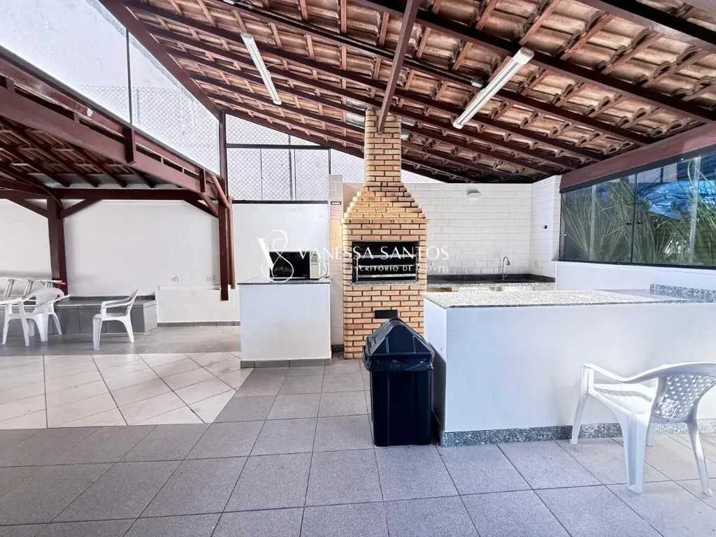 Condomínio de torre única com piscina, salão de festas, churrasqueira e playground.