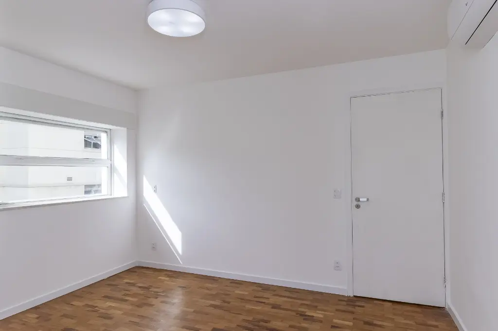 Esse apto de 141 m² tem aquela combinação rara que inclui muita luz natural, vista incrível, e um projeto muito bem resolvido. A sala ampla, com seu janelão do chão ao teto, deixa a claridade preencher cada canto e realça o charme do piso em mini parquet, que aquece o ambiente. O pilar em concreto aparente traz textura ao espaço social.