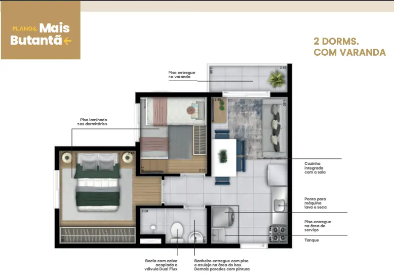 Unidade de 35m², 2 dormitórios, varanda R$ 331.900,00 ( HIS2 )