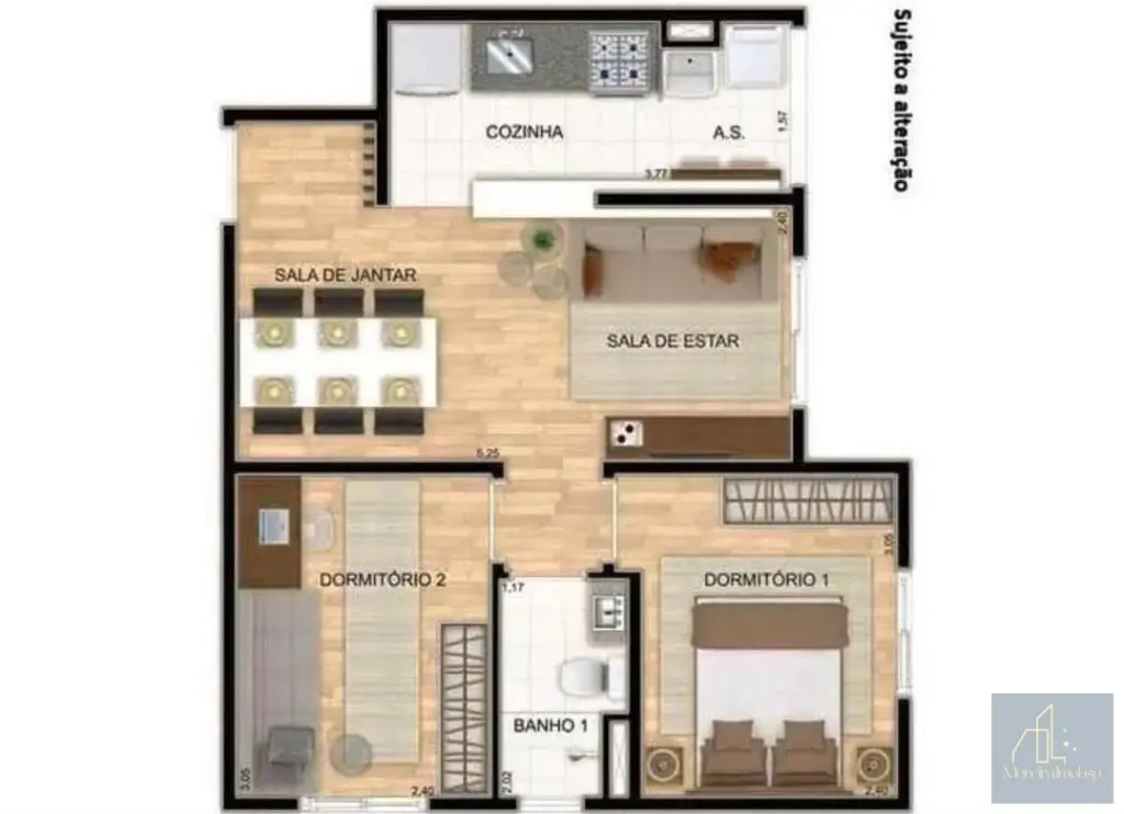 2 dormitórios, sala, cozinha, área de serviço e 1 banheiro social.