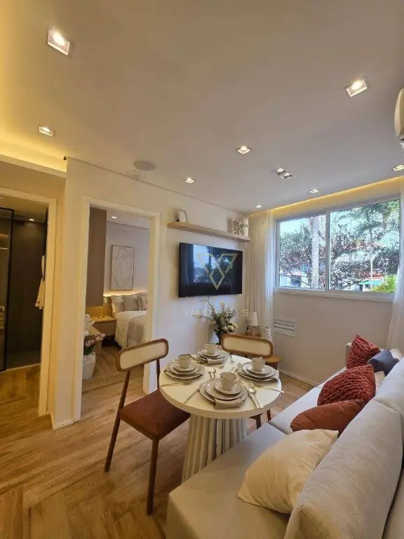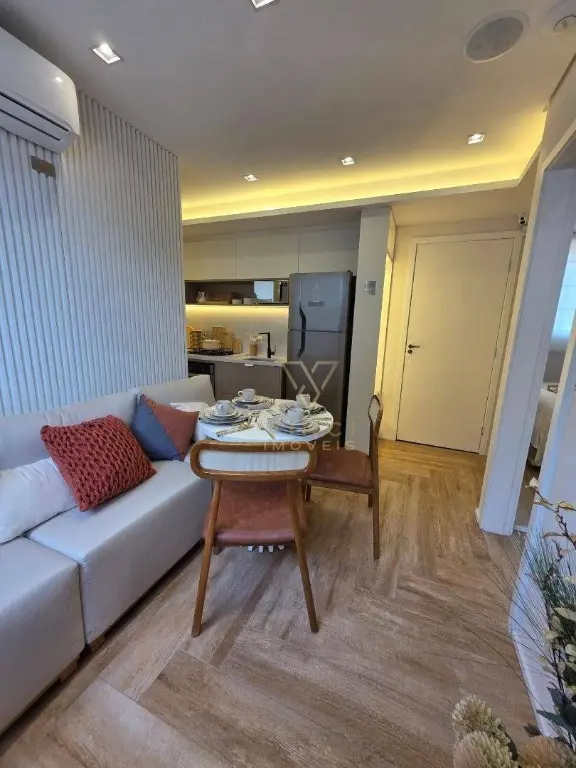 Apartamento novo a partir de 32 m² distribuído em cozinha e living com conceito aberto, sala para dois ambientes, área de serviço, 02 dormitórios, 01 banheiro social e sem vaga de garagem.