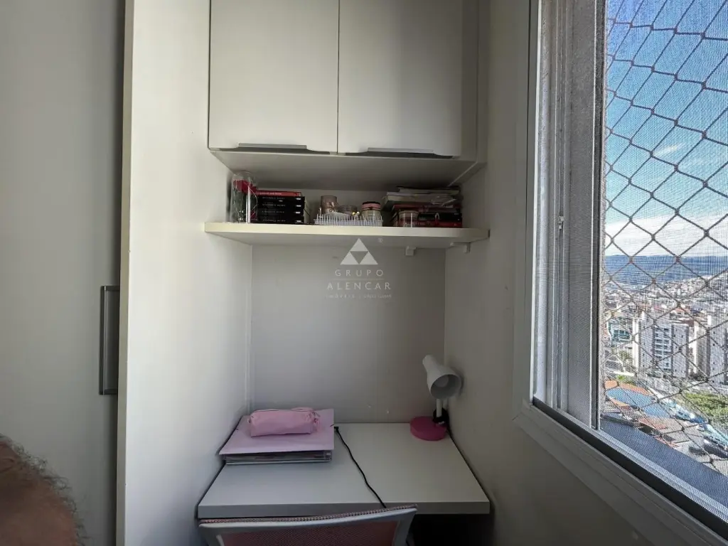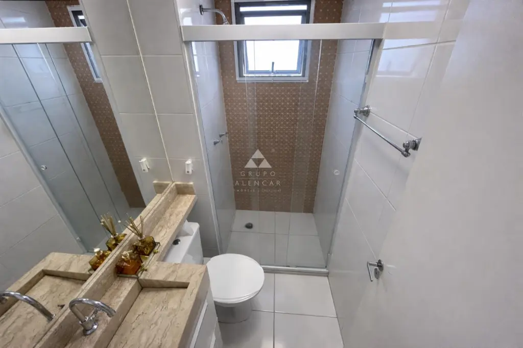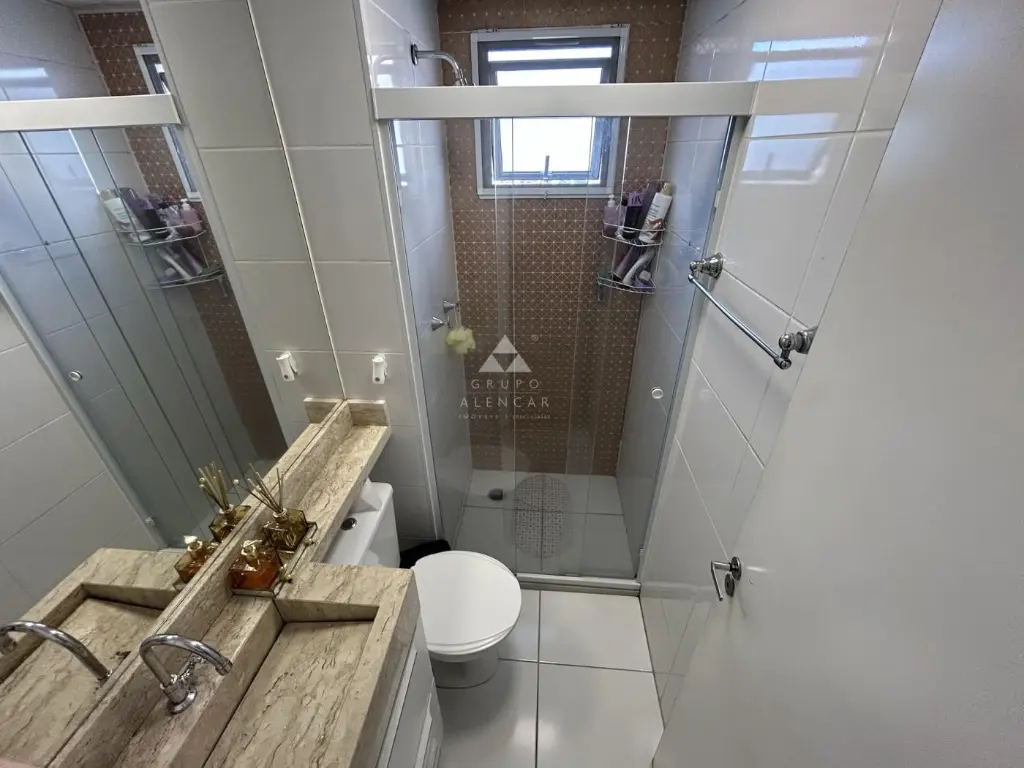 O banheiro, equipado com armário planejado e box de vidro, atende aos dois dormitórios com conforto e praticidade.