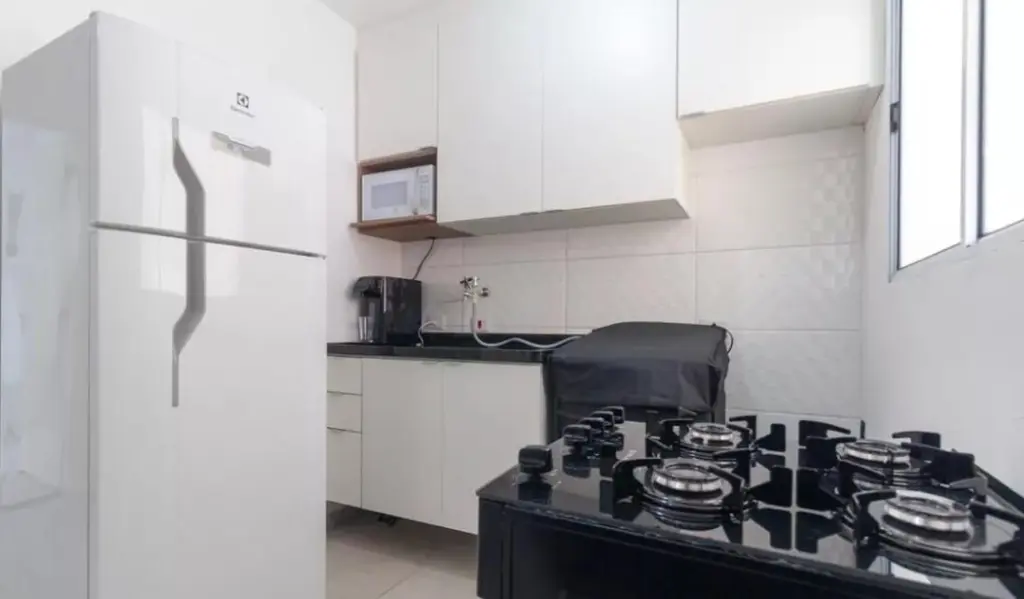 2 dormitórios, sala, cozinha, banheiro, área de serviço, churrasqueira, lavanderia no terraço, sacada e elevador.