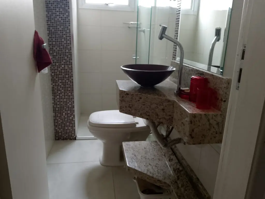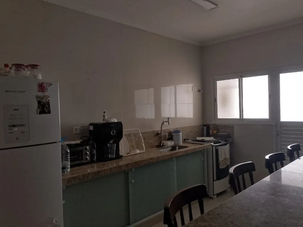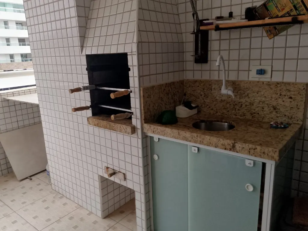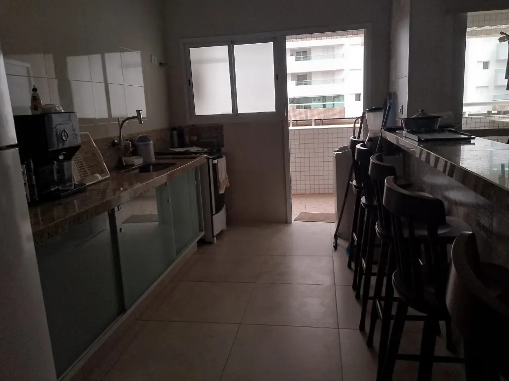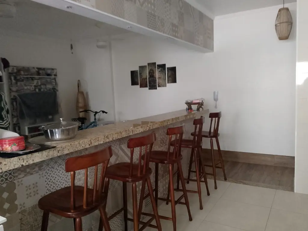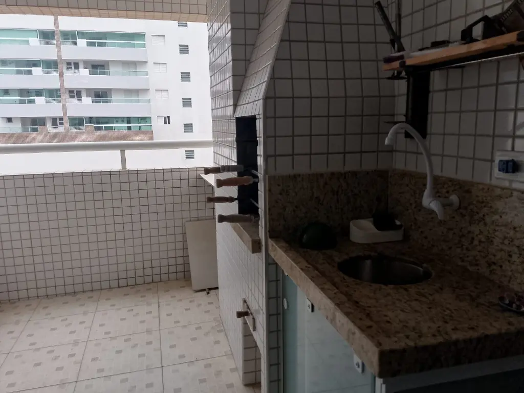 Fica localizado no Centro de Mongaguá, próximo a praia contém dois dormitórios sendo um suíte, sala, cozinha, banheiro social, cozinha, área de serviço, varanda com churrasqueira, 75m2, uma vaga de garagem