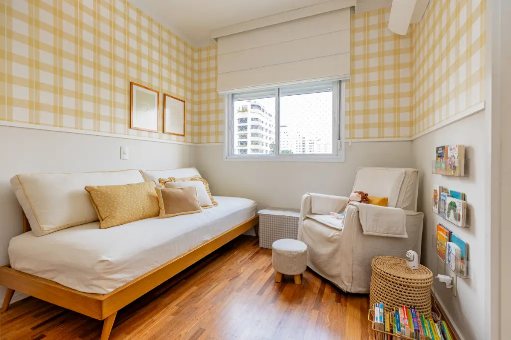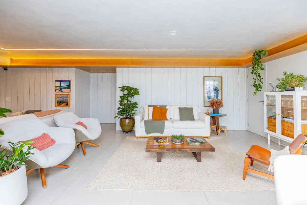 Ele tem 161 metros quadrados, living dividido em três ambientes: estar, tv e jantar . Um lavabo discreto com a porta disfarçada pela parede de madeira. Seguindo o living temos o corredor e encontramos 3 suítes amplas. A cozinha é impecável e toda reformada com marcenaria planejada, lavanderia, quarto e banheiro de funcionária, 3 vagas de garagem marcadas. Ar condicionado em todo o apartamento.