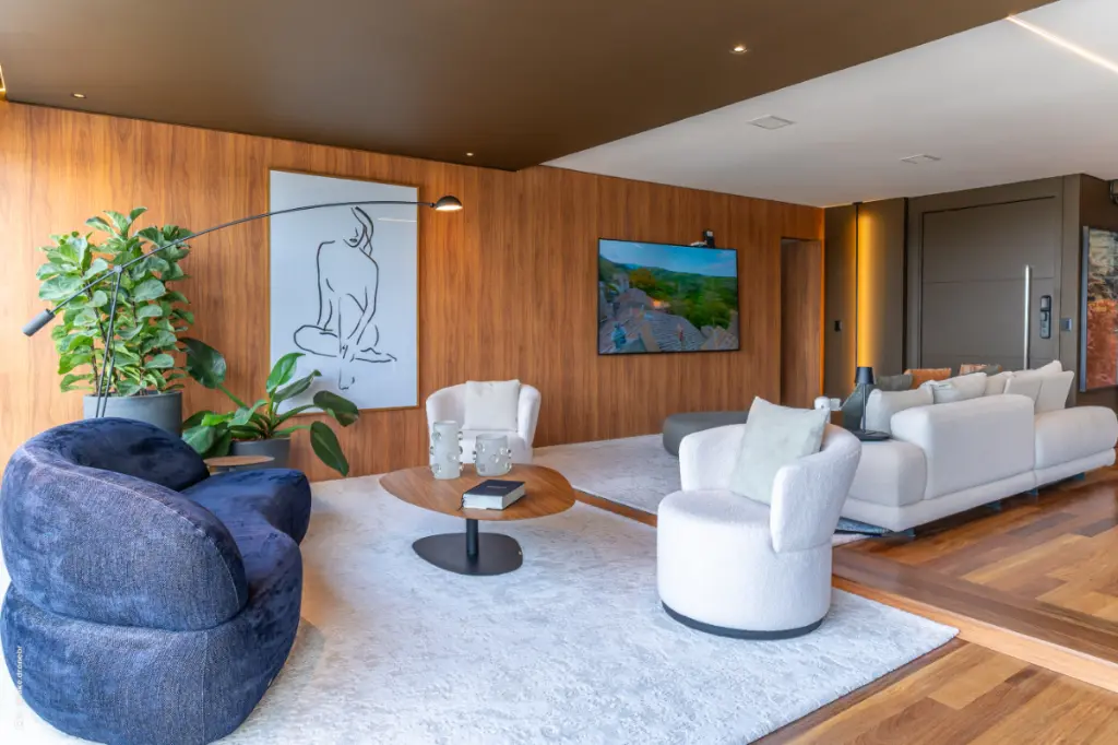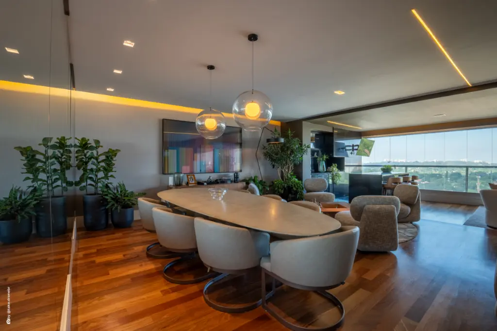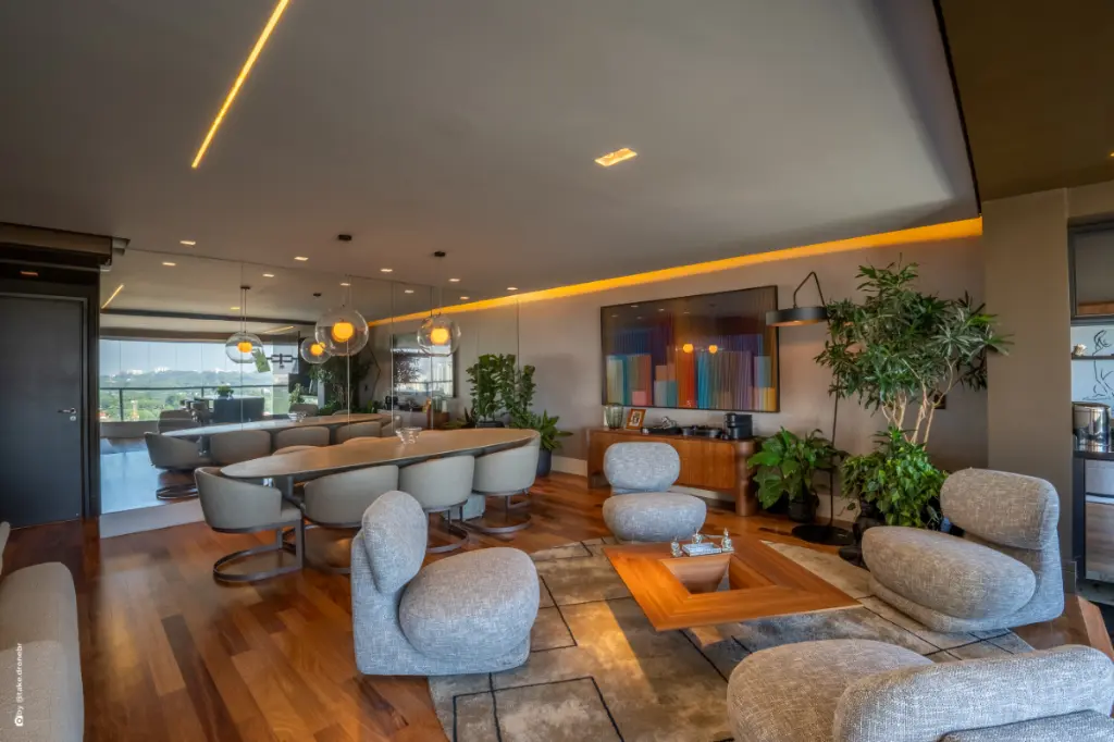 Sala ampla para 3 ambientes, integrada ao espaço gourmet com churrasqueira, criando um cenário elegante e perfeito para momentos inesquecíveis.