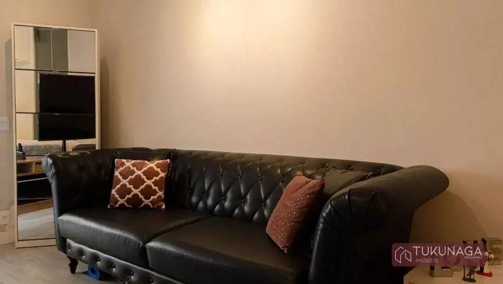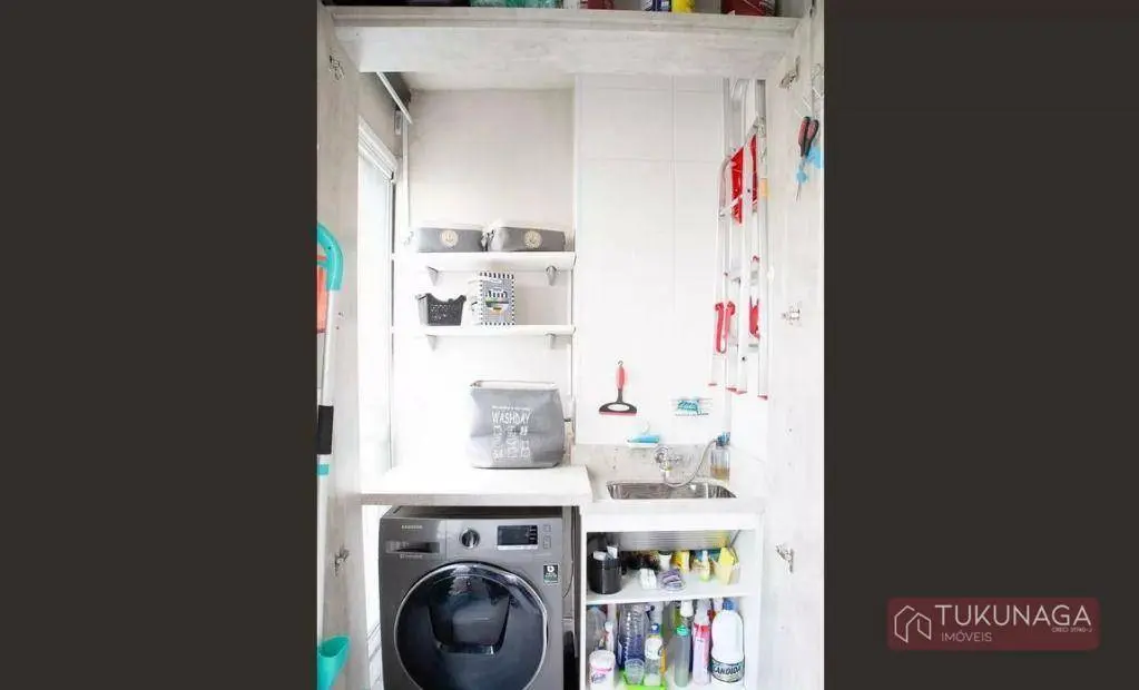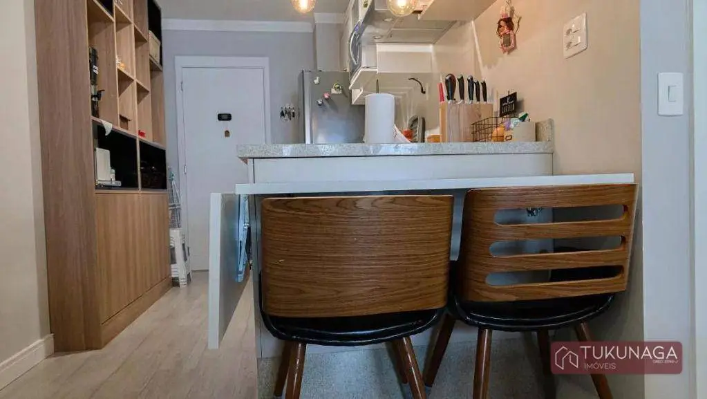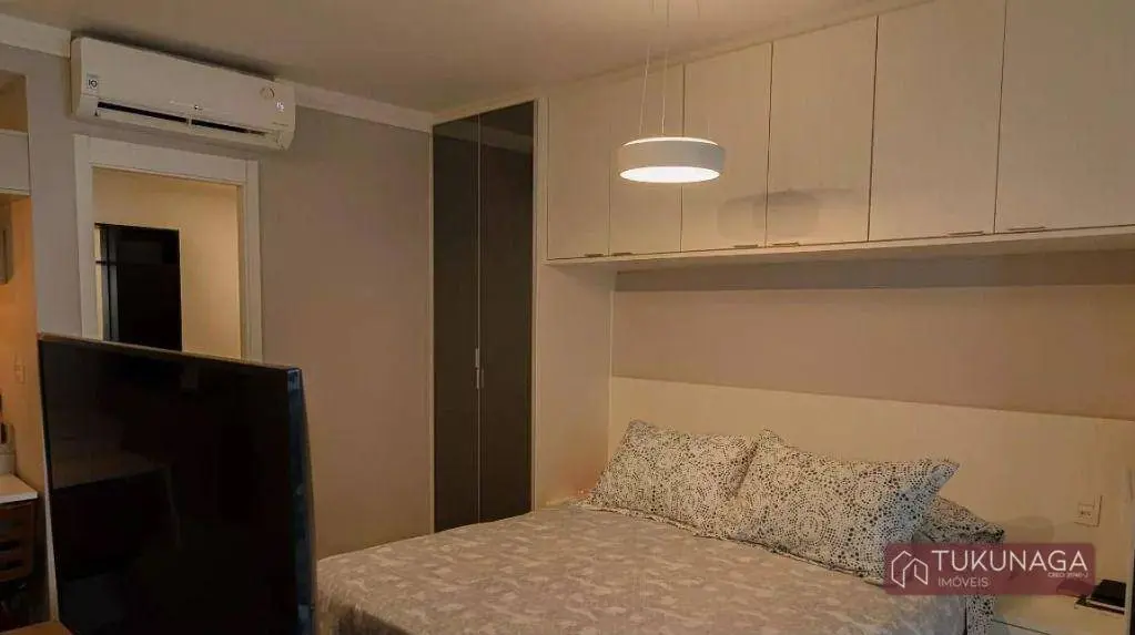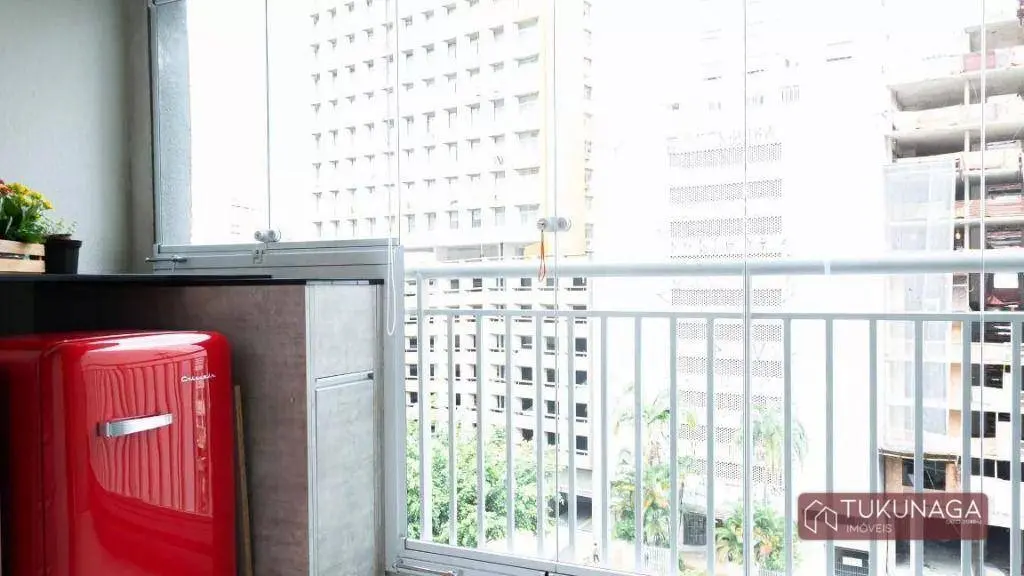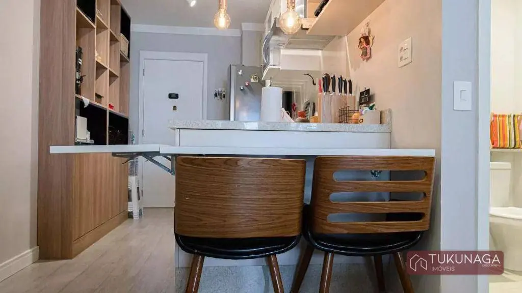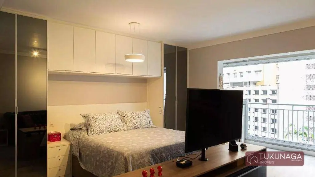 O imóvel conta com 01 dormitório amplo com acesso à sacada, integrado à sala de estar, cozinha estilo americano com armários planejados, lavanderia envidraçada com armários embutidos, 01 banheiro com gabinete e box em vidro, 01 vaga de garagem coberta fixa.