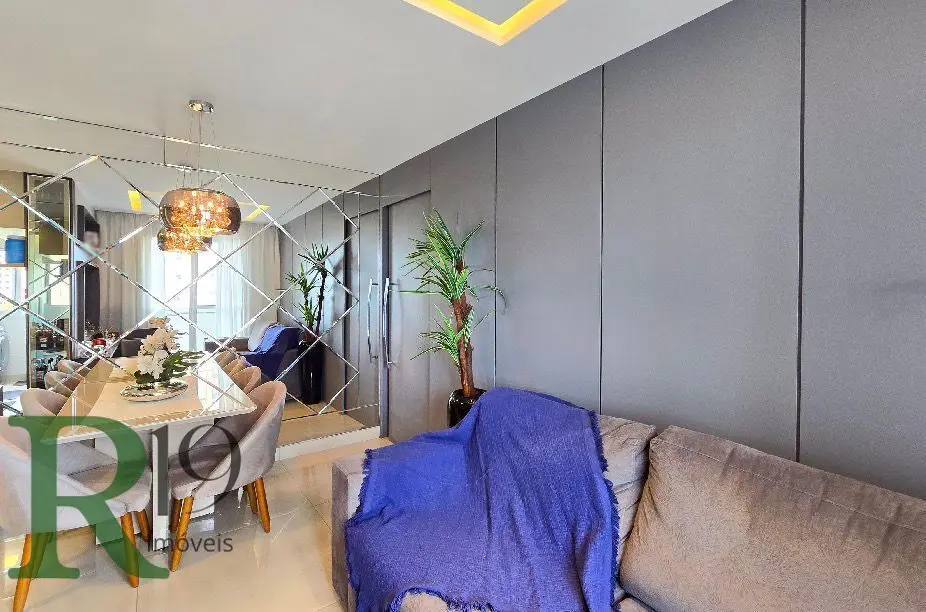 Sala para dois ambientes com espelho, teto rebaixado, iluminação embutida e sacada envidraçada