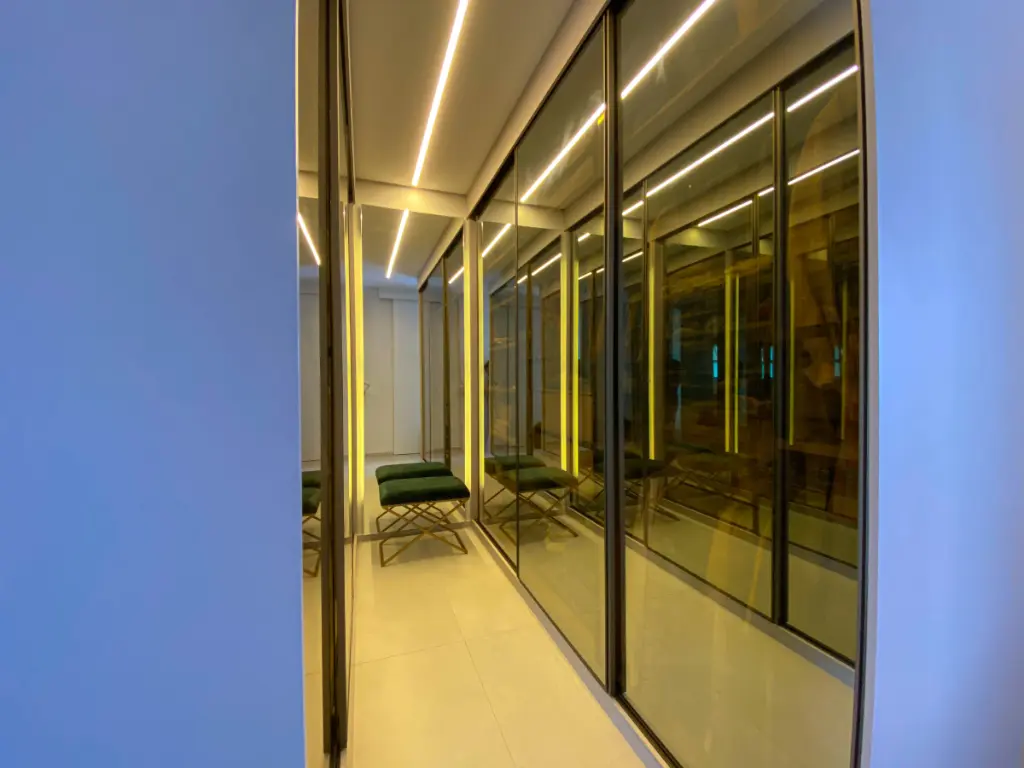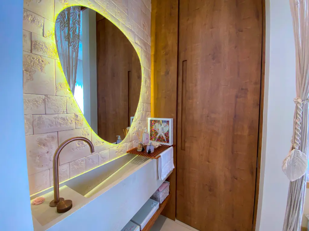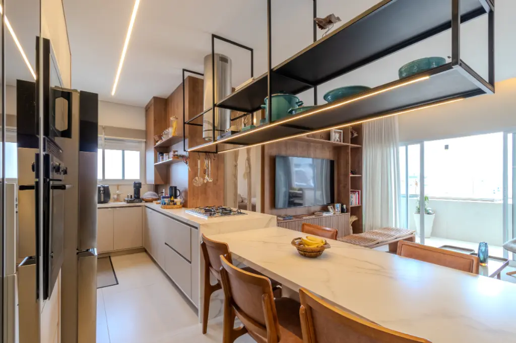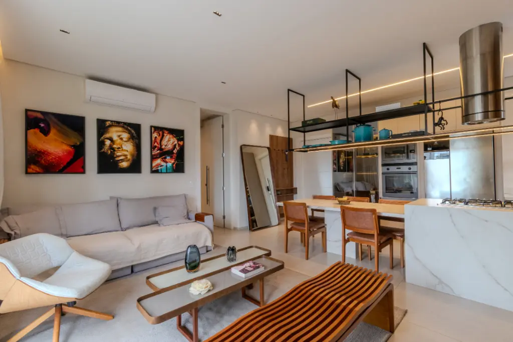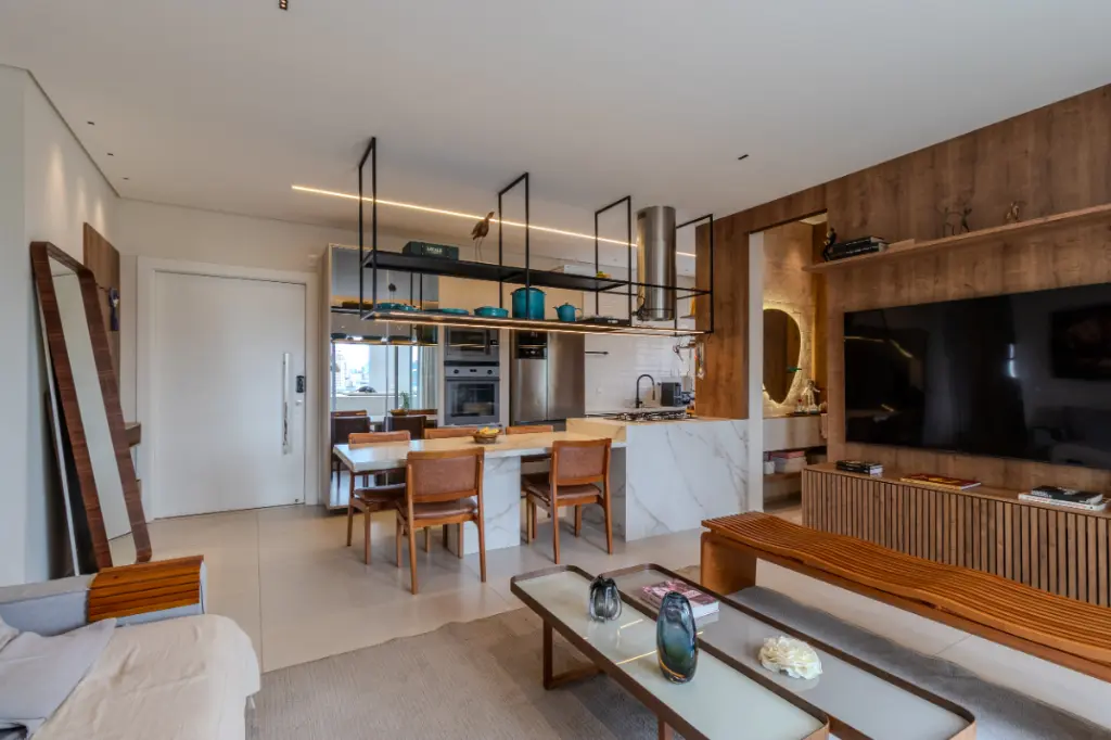 O uso de madeira e materiais nobres reforça a sensação de acolhimento e elegância.