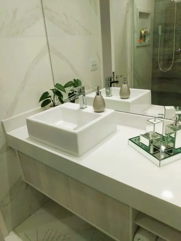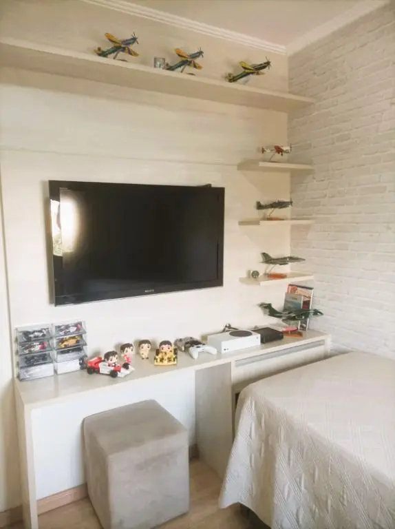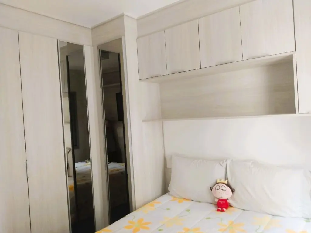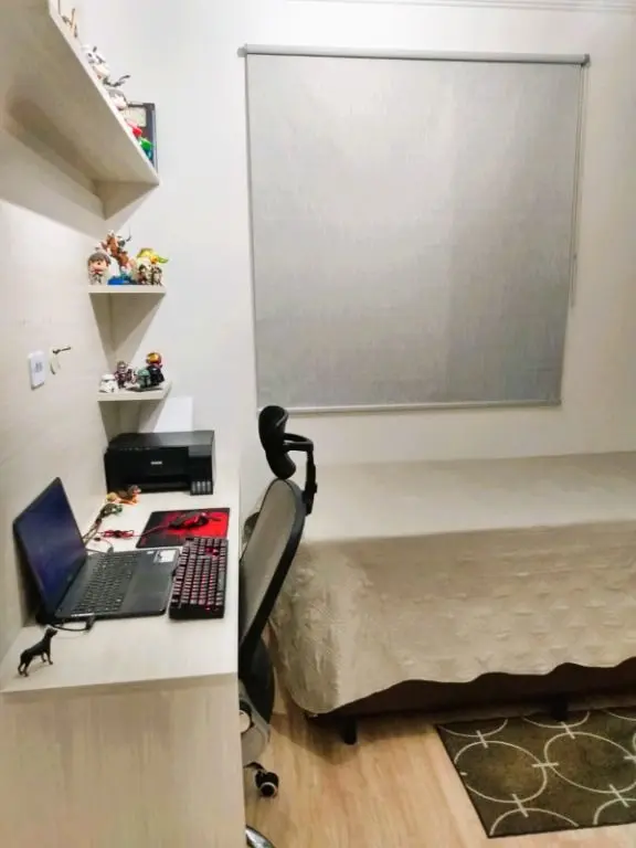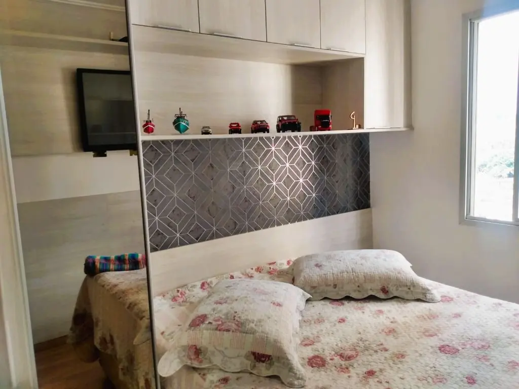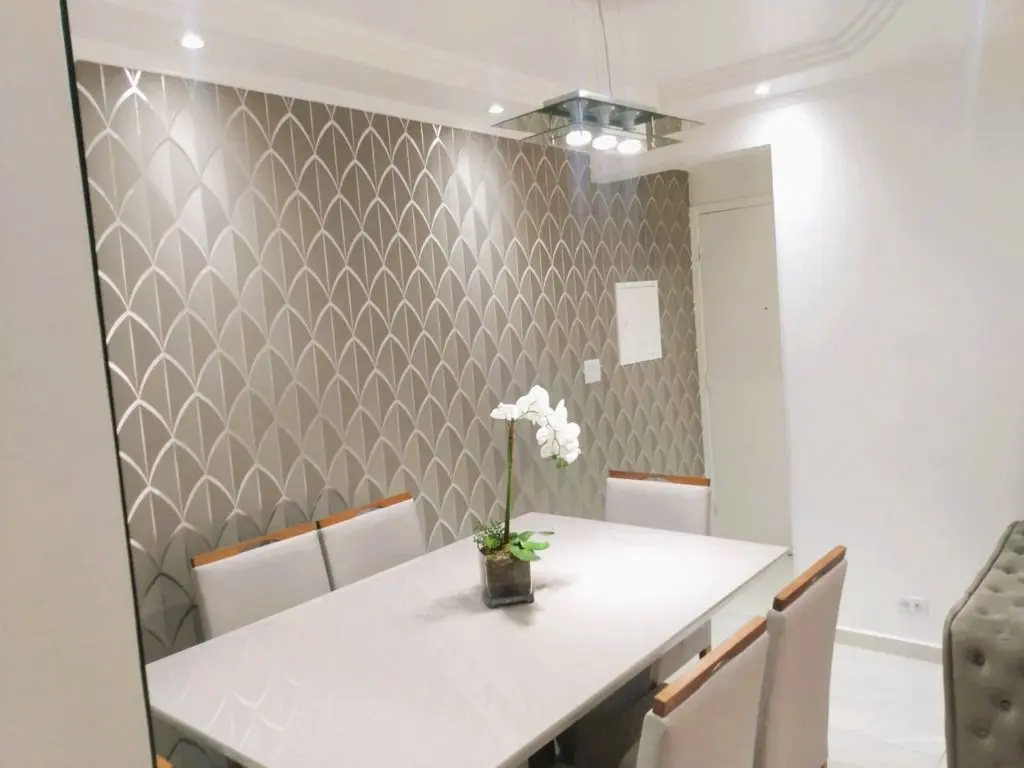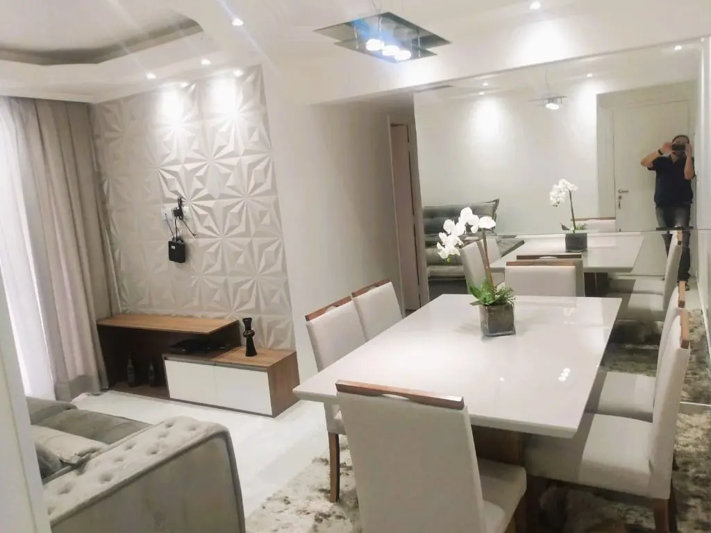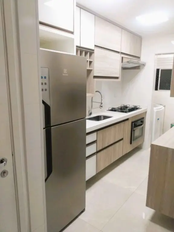 Com porcelanato na sala e na cozinha, piso laminado nos quartos, papel de parede, rebaixo de gesso, lustres modernos, armários planejados da Italínea.