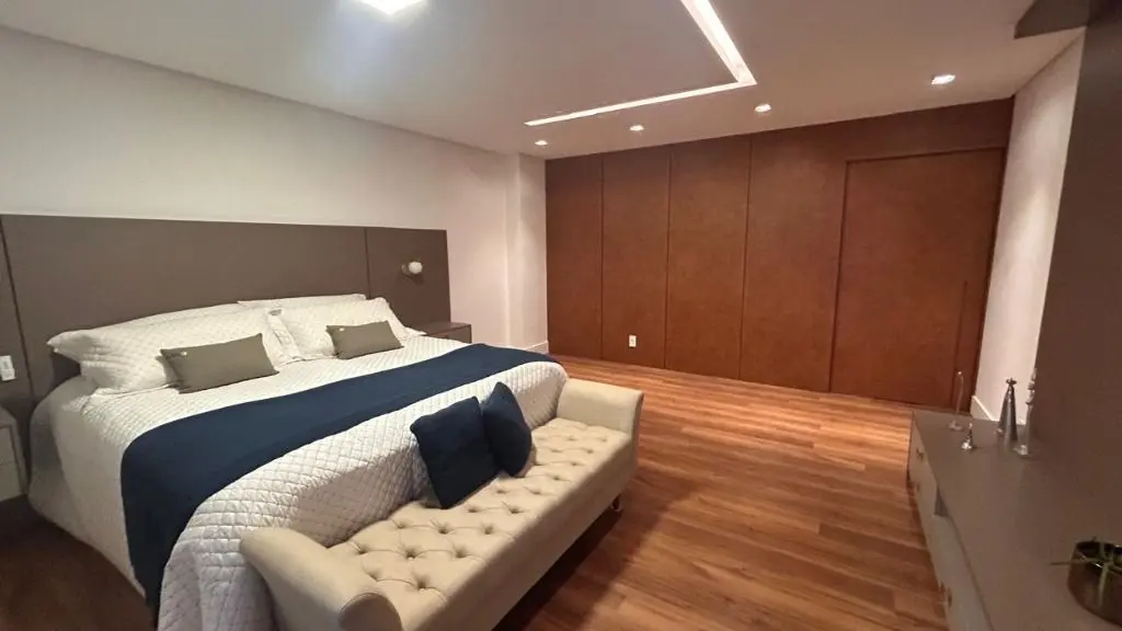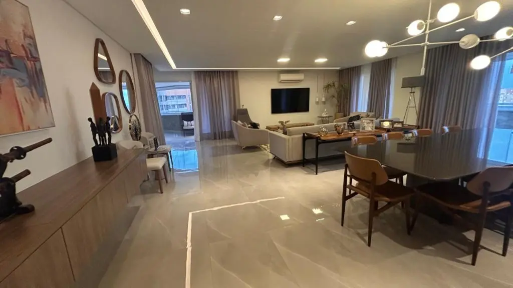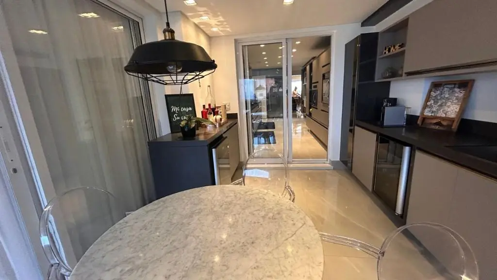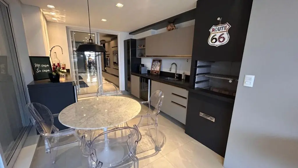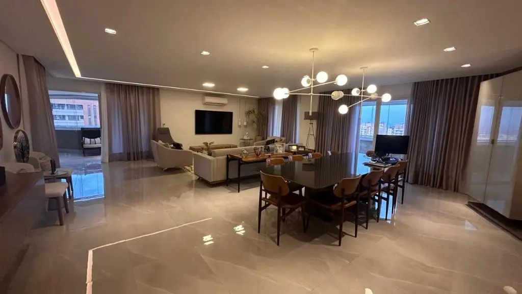 Os ambientes integrados revelam um living amplo e sofisticado, onde a decoração contemporânea se harmoniza com acabamentos de alto padrão, criando uma atmosfera acolhedora e impressionante. A cozinha, planejada e equipada com eletrodomésticos modernos e armários sob medida, oferece o equilíbrio perfeito entre praticidade e elegância, ideal para quem aprecia o prazer de receber bem.