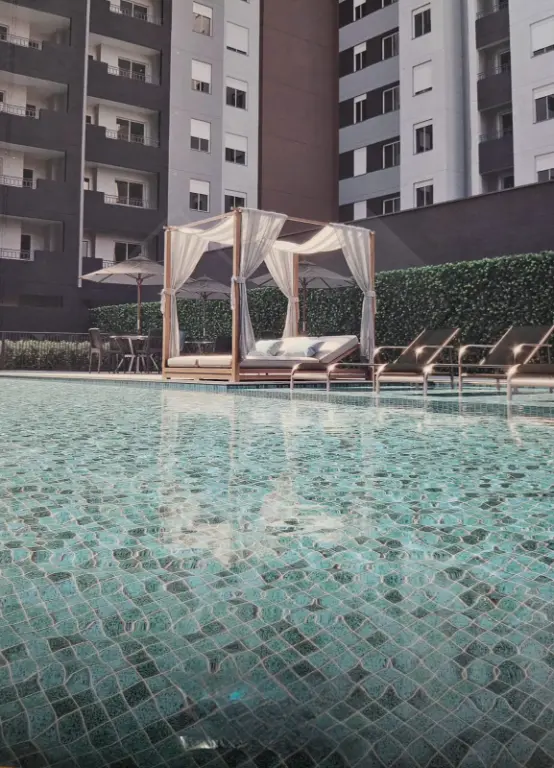 Lazer com piscina adulto e infantil, playground, brinquedoteca, salão de festas. salão de jogos, bicicletario, espaço beleza, lavanderia e mini mercado.