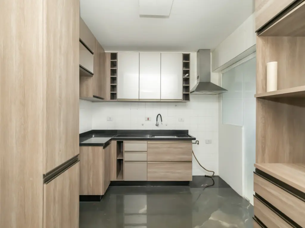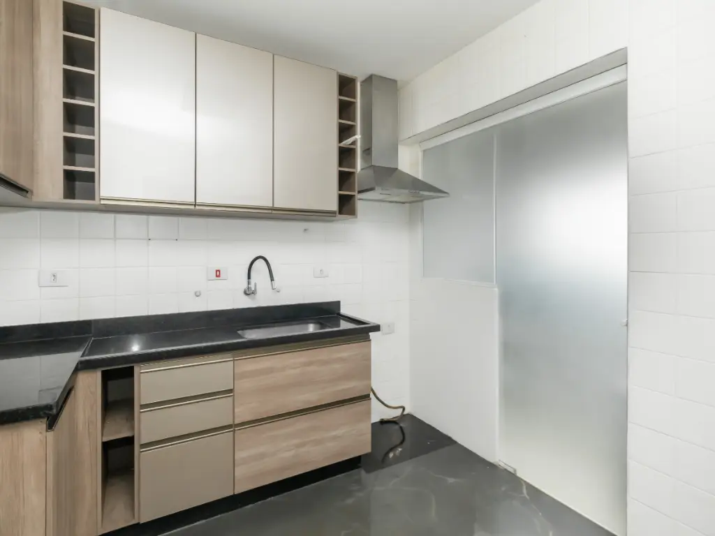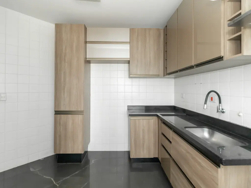 A sala é aconchegante, integrada à sacada com vista, ideal para momentos de descanso. A cozinha planejada alia design e praticidade, com armários sob medida, além de área de serviço bem ventilada.