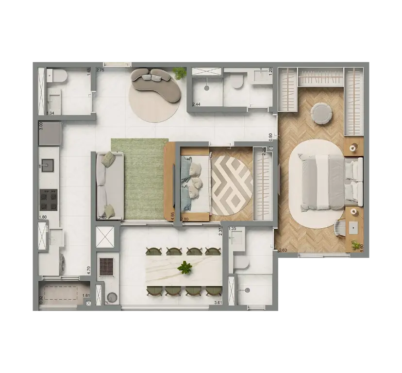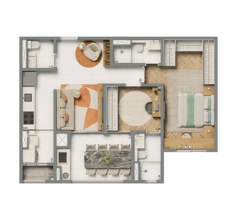 Apartamento de 69 m², com lazer completo e mini marketing 24 horas.
