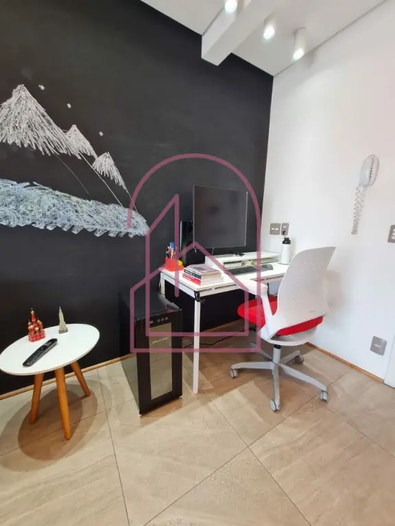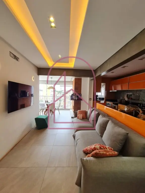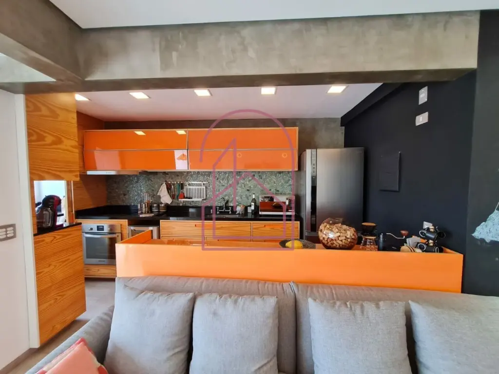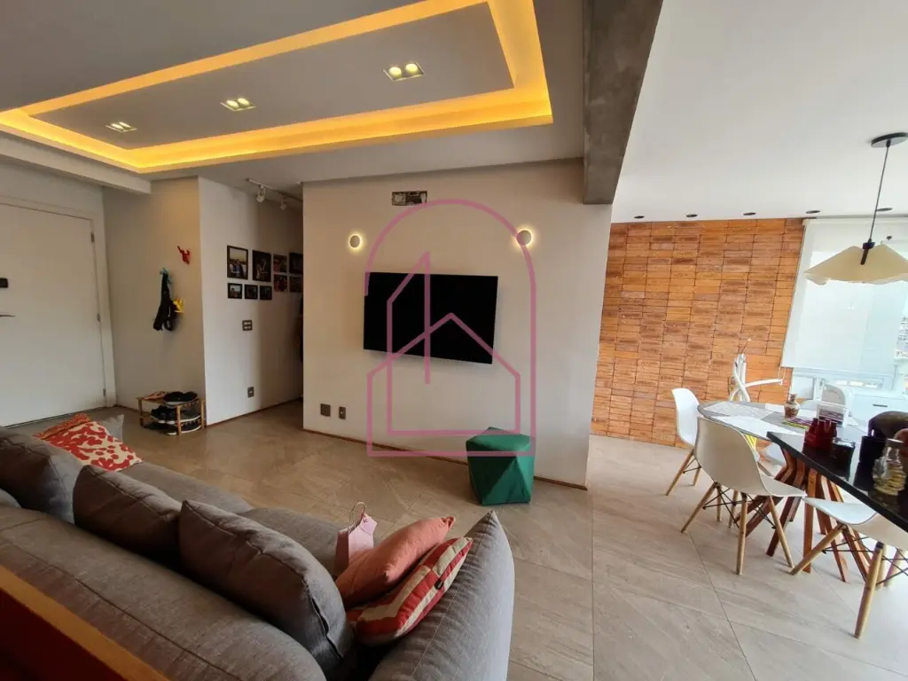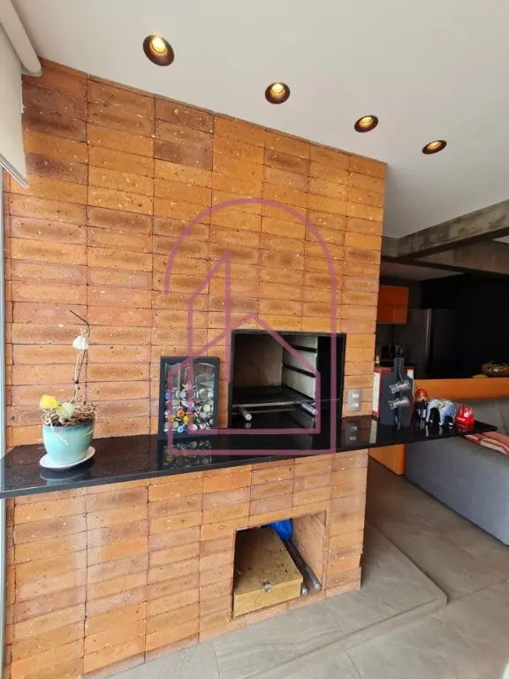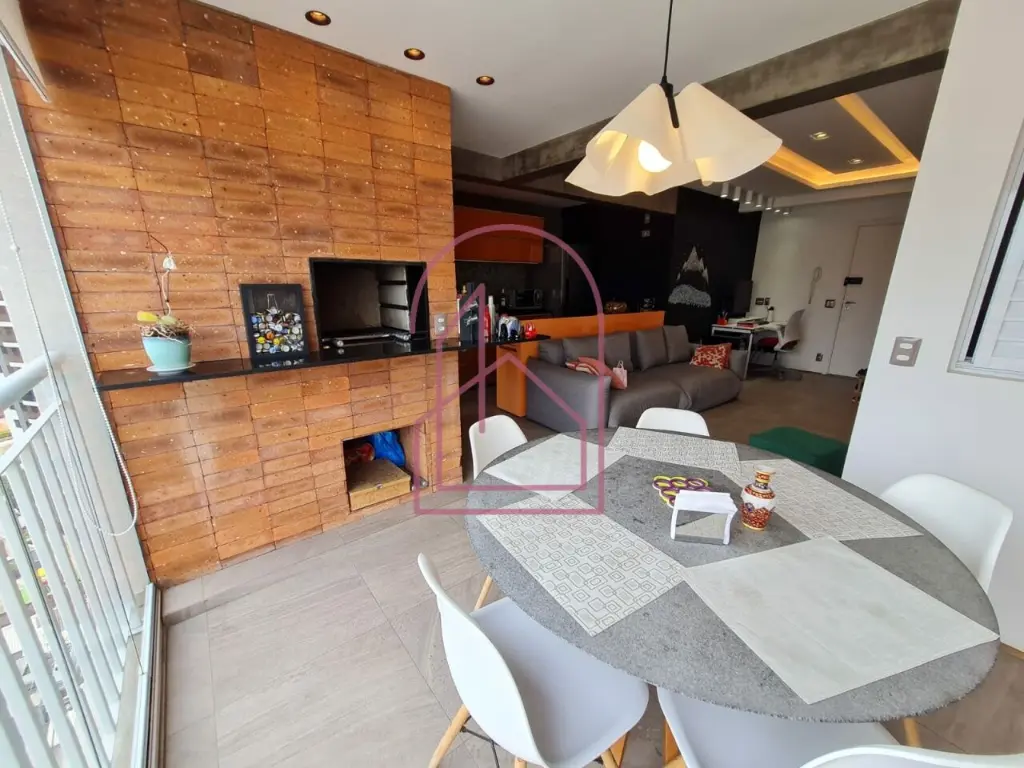 A sala se conecta à varanda nivelada, criando uma sensação ampla e contínua. Na varanda, um espaço especial foi criado com canto de bar e churrasqueira, com acabamento em cerâmica de ótimo gosto, imitando tijolinho, trazendo charme e personalidade ao ambiente.