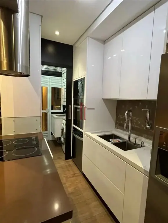 Cozinha integrada à sala de jantar e estar, equipada com cooktop de indução e armários planejados