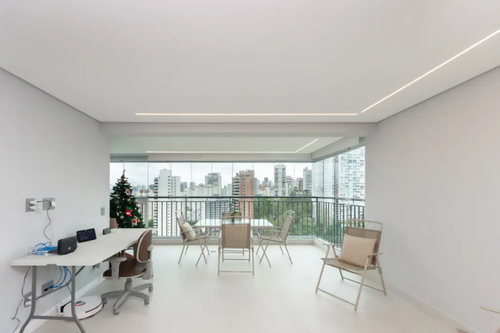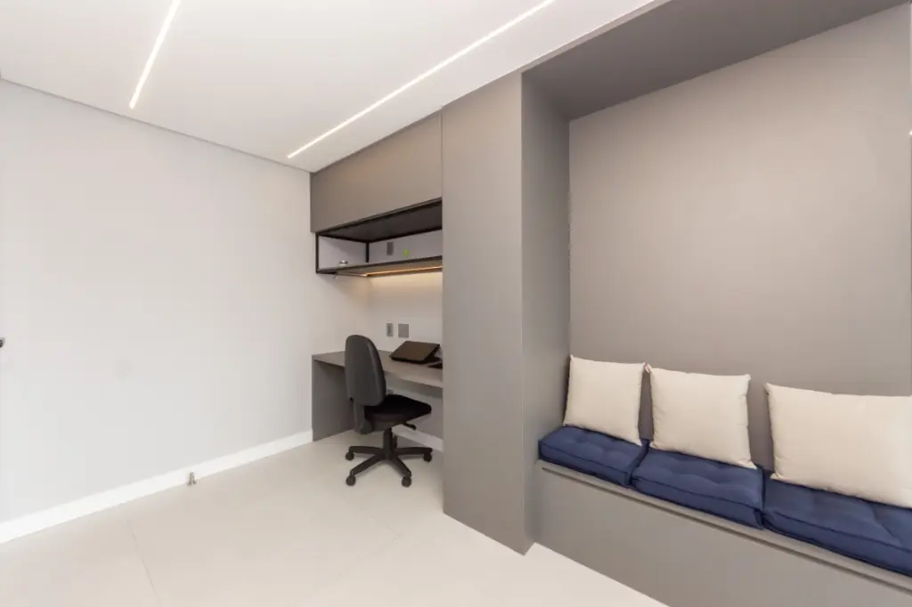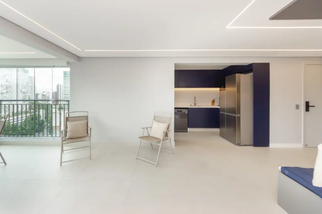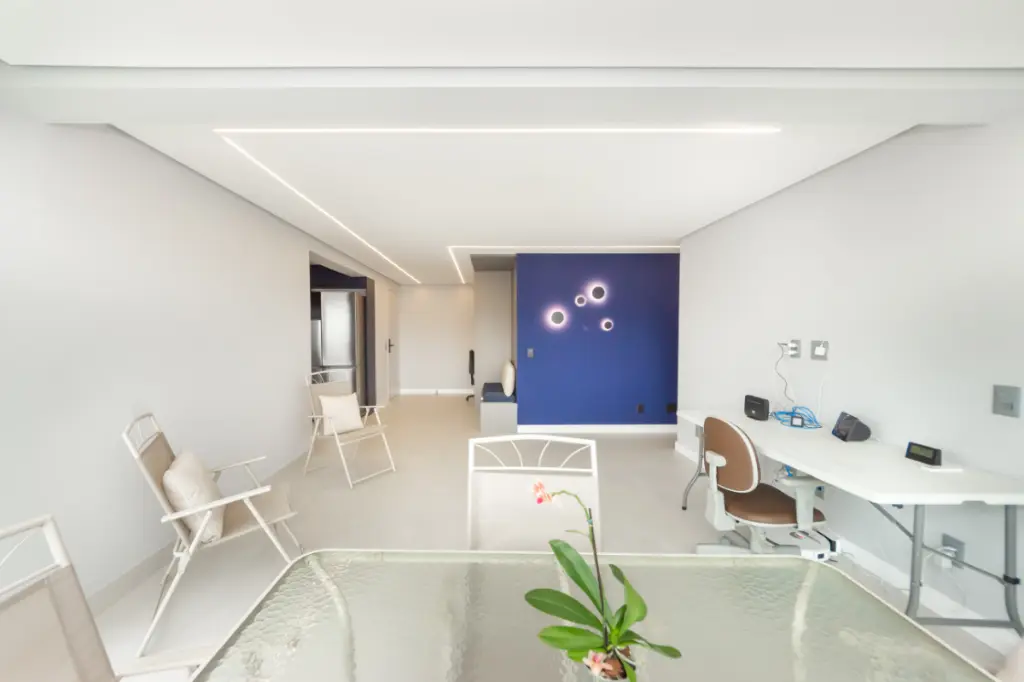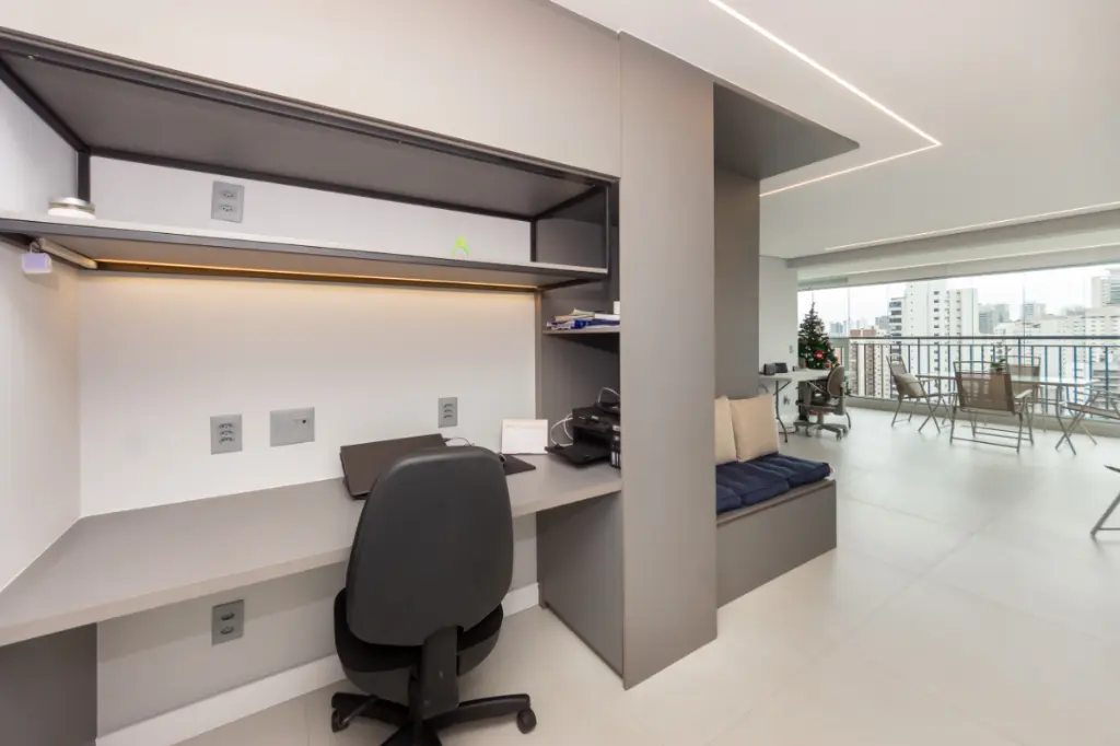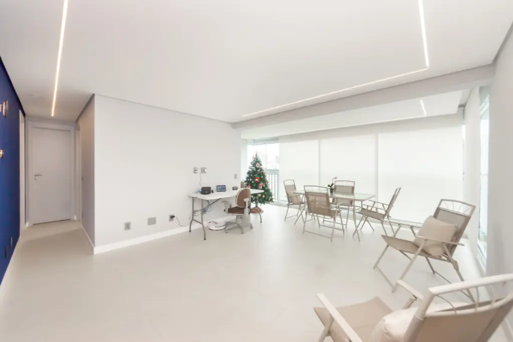 A sala ampla convida a desacelerar. A luz entra com suavidade, a varanda integrada amplia o espaço e cria o cenário perfeito para um café pela manhã, um vinho no fim do dia ou conversas que se estendem sem pressa, além de uma vista permanente. Tudo é automatizado, iluminaçãoe persianas trazendo conforto, praticidade e aquela sensação gostosa de morar em um lugar que cuida de você.