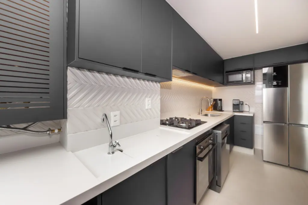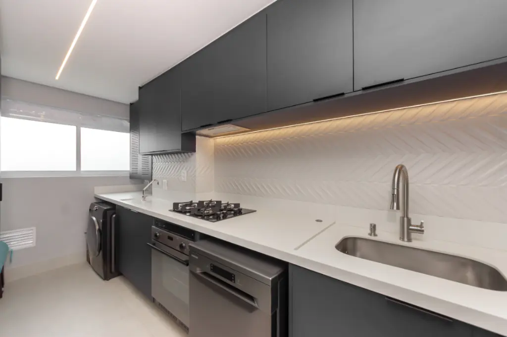 A cozinha totalmente montada, com armários modernos e funcionais, já com fogão, geladeira, coifa e máquina de lavar roupas .Está pronta para receber receitas simples do cotidiano ou jantares especiais. Tudo novo, funcional e elegante, como um convite para viver a casa de verdade, além da área de serviço toda estruturada para o dia a dia .