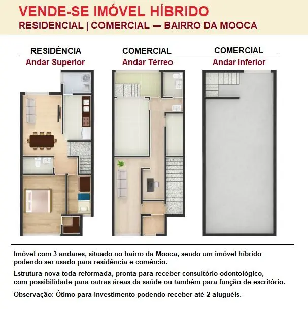 Totalmente reformado tendo na parte inferior sala de recepção, banheiro, sala de consulta e recepção. Parte superior são dois dormitórios com sala, cozinha, lavanderia e banheiro totalmente mobiliado.