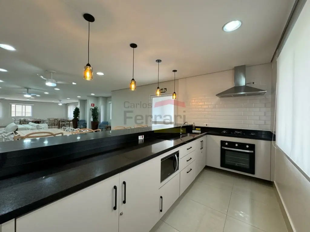 Sala para dois ambientes, varanda com churrasqueira a carvão, cozinha independente e área de serviço.