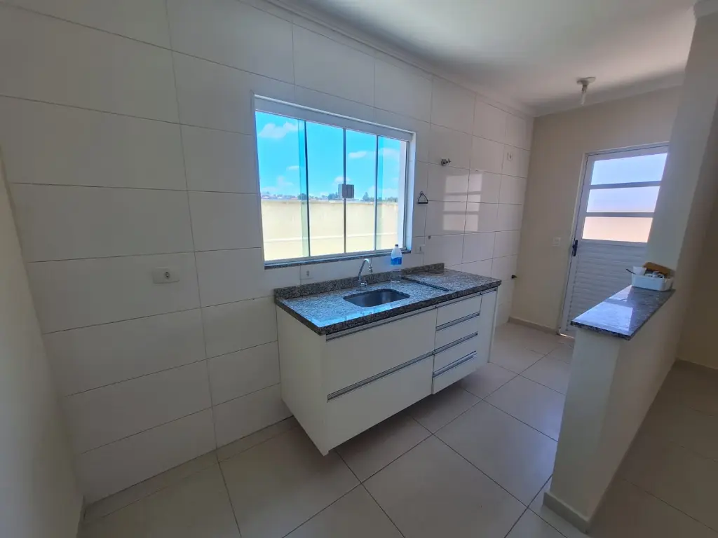 cozinha com janela enorme acima da pia e porta para quintal