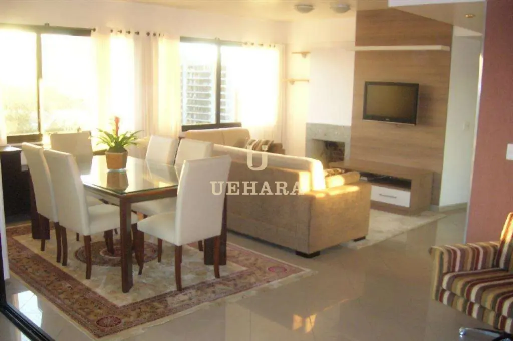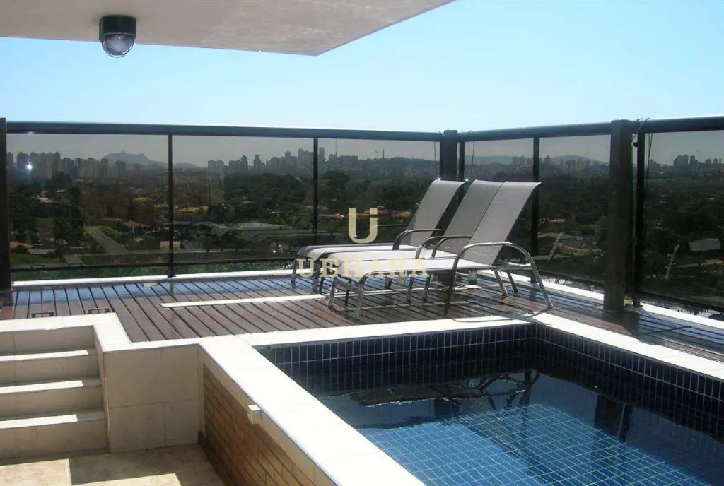 Cobertura de 620m², que compreende as lajes 8 e 9 inteiras, 03 suítes e 01 dupla master, lareira, salas, cozinha, despensa, área de serviço, terraço, suíte de empregada, piso de granito e porcelanato, 04 vagas de garagem demarcadas, depósito anexo, piscina e sauna privativa, solarium.