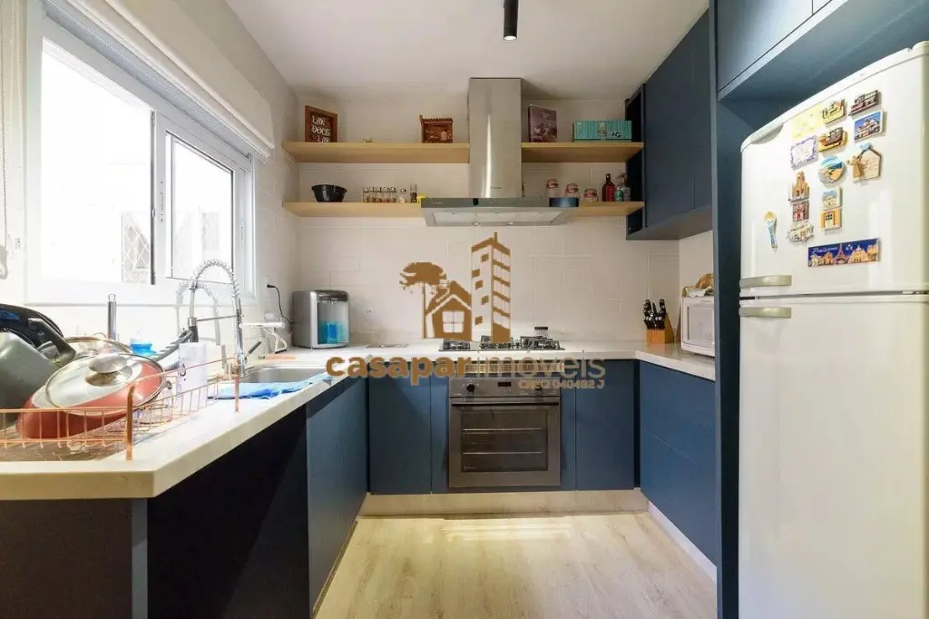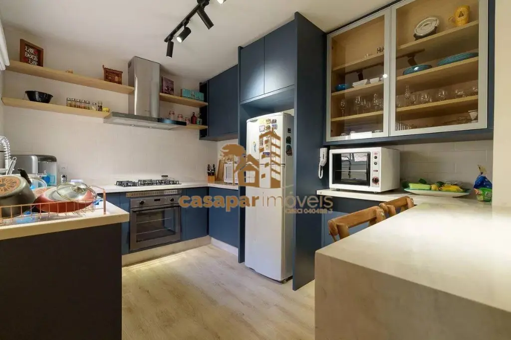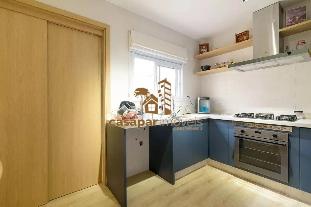 A cozinha americana, também com armários planejados, é prática e funcional, ideal para o preparo de refeições e momentos de confraternização com a família e amigos.
