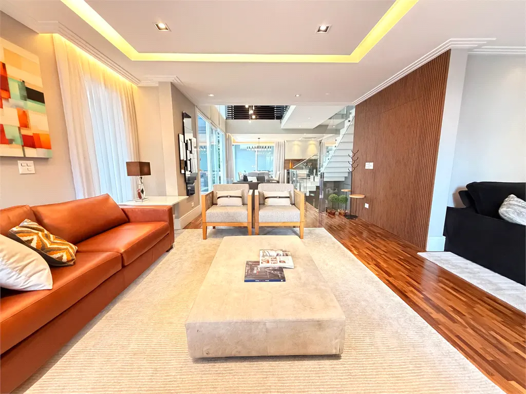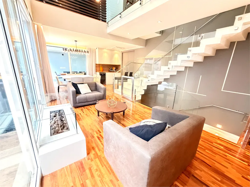 Social & Design: Living monumental com pé-direito duplo de 6 metros, lareira a gás e home theater. Ambientes integrados que conectam a sala de jantar à cozinha com copa e à área gourmet.