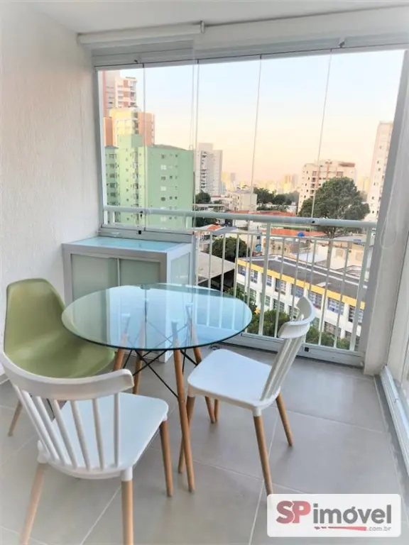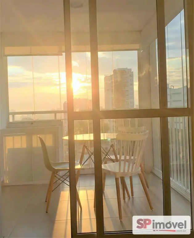 Studio completo e pronto para morar, com vista livre e sol nascente, varanda envidraçada, com sistema retrátil e persianas, além de mesa de jantar em vidro com quatro cadeiras e espaço técnico planejado para a condensadora do ar-condicionado, ambiente interno com marcenaria planejada, acabamento em porcelanato, cama box queen size com colchão pillow e cortina blackout, ar-condicionado Samsung inverter quente/frio, Smart TV 40', cozinha completa com cooktop de indução, micro-ondas, depurador e geladeira Brastemp inox frost free, mesa de trabalho/estudos com suporte para notebook, fechadura eletrônica, tomadas USB e banheiro com ventilação natural.