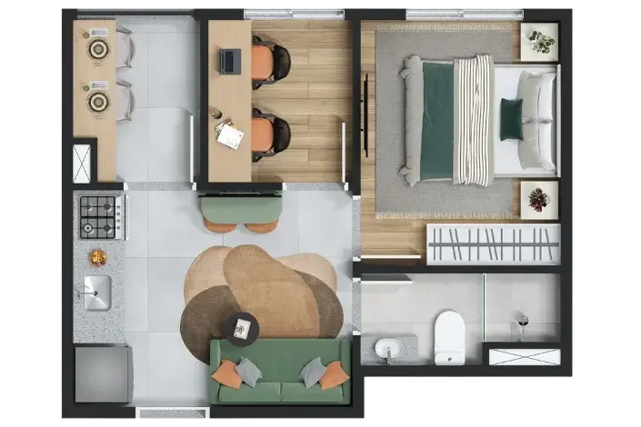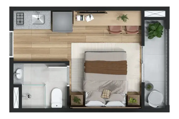 Planta de 18m² Studio com sacada + ponto para ar condicionado.