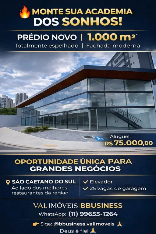 **Oportunidade Única em São Caetano do Sul!** **Santa Paula | Av. Kennedy x Alameda São Caetano** Salão Comercial de **748m²** **20 vagas** **Locação: R$ 75.000,00** Fachada imponente de vidro Pé-direito duplo Opção de divisão em até 3 lojas Região com alto fluxo de pessoas e grandes marcas Agende já sua visita com a **VAL IMÓVEIS ? BBUSINESS** WhatsApp: (11) 96655-1264 Siga no instagram bbusiness.valimoveis Deus é bom o tempo todo #SãoCaetanoDoSul #SantaPaula #Kennedy #ImóvelComercial #Locação #AltoPadrão #VALImóveis #BBusiness #Oportunidade #ImóvelDeEsquina #Franquias #Visibilidade