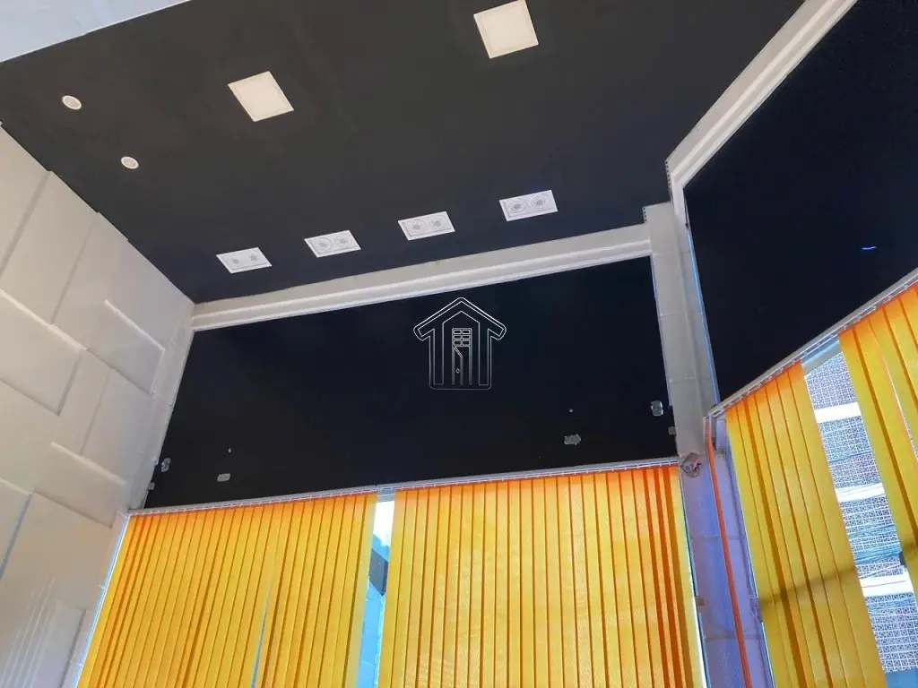 amplo salão, com portas de vidros, onde pode funcionar uma recepção com sala de espera