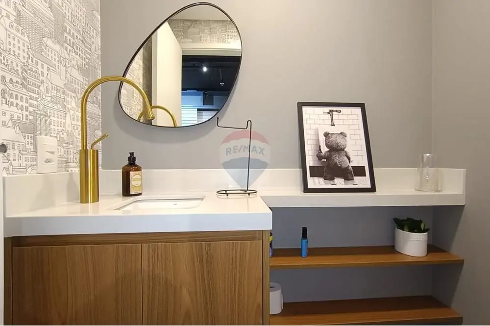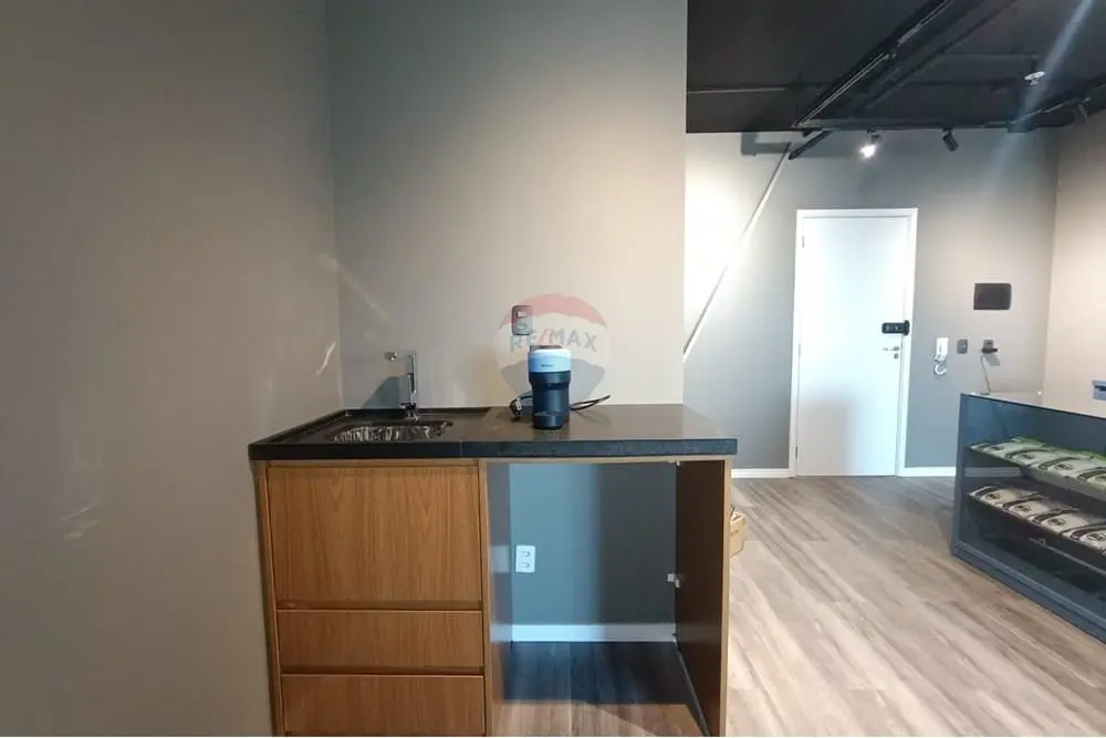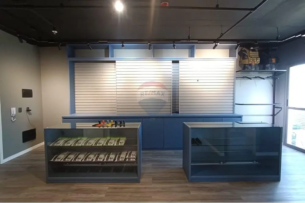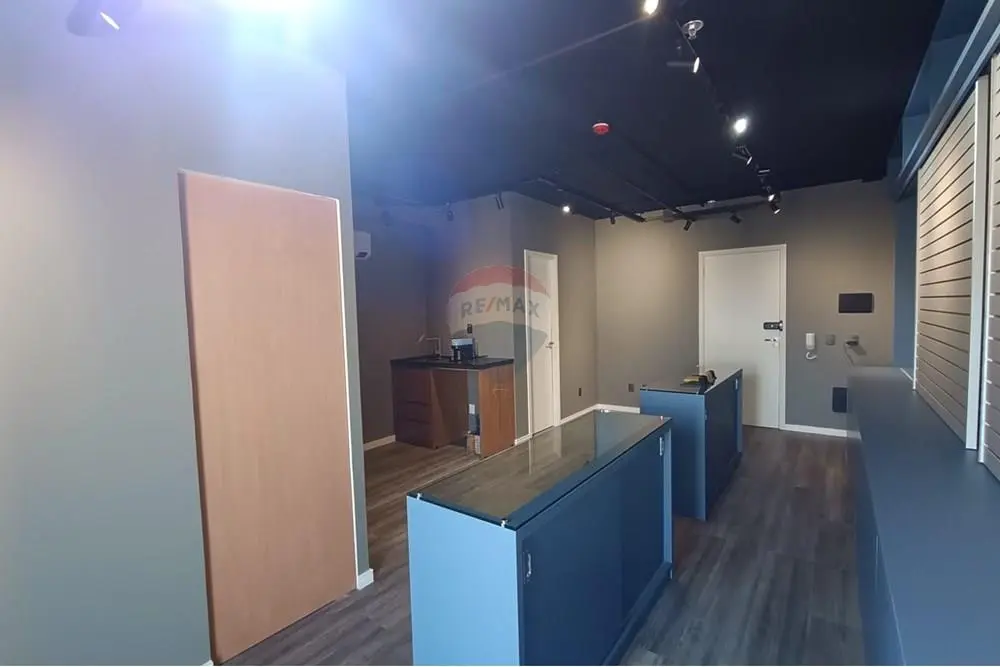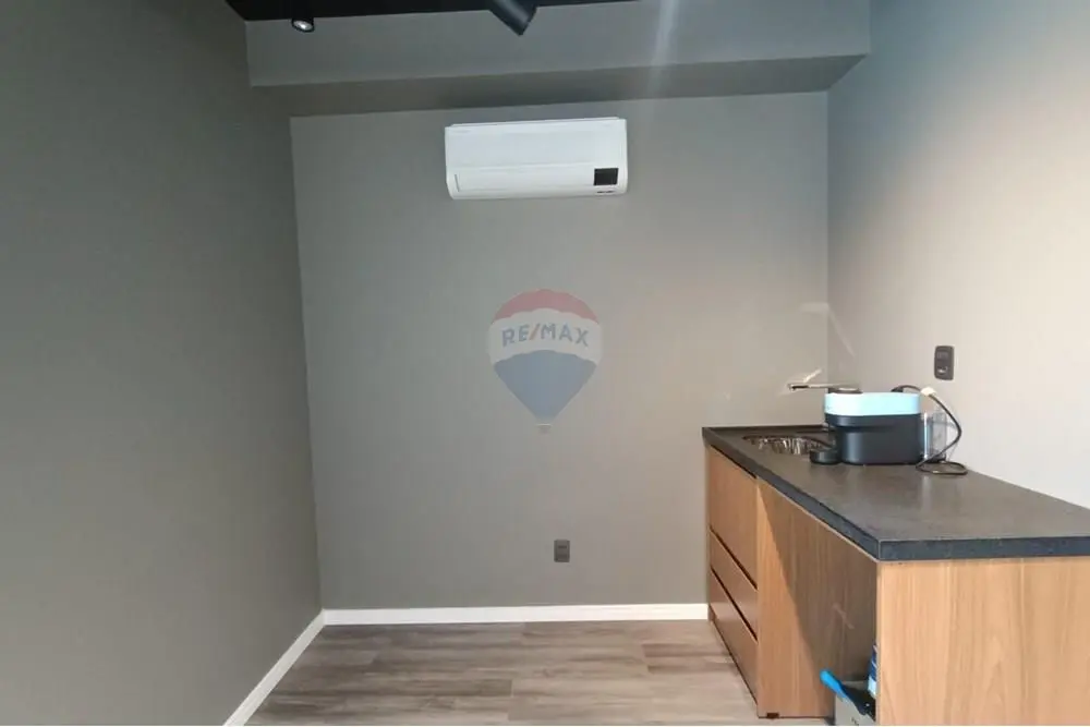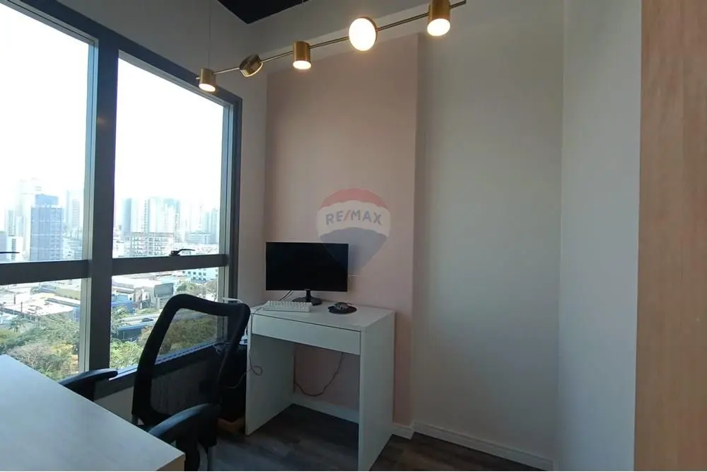 A sala se encontra PRONTA, mobiliada com 2 balcões de demonstração e armazenamento de produtos, estante planejada, copa com ponto de pia e armário planejado, banheiro com móveis planejados e sala individualizada, com estação de trabalho piso laminado, teto rebaixado com projeto de iluminação embutida, sistema de segurança de sprinklers, um aparelho de ar condicionado, muito bem arejado com localização privilegiada e com o máximo de aproveitamento de insolação durante boa parte do dia e mais uma bela sacada com vista livre.