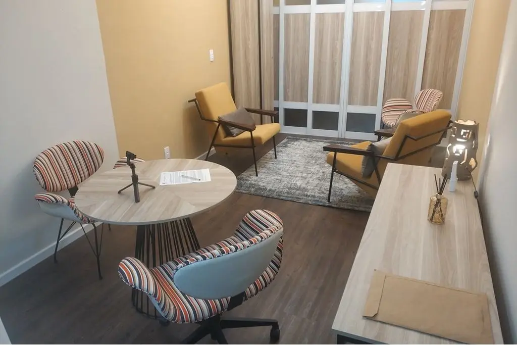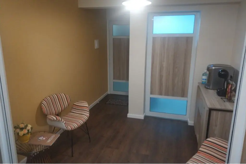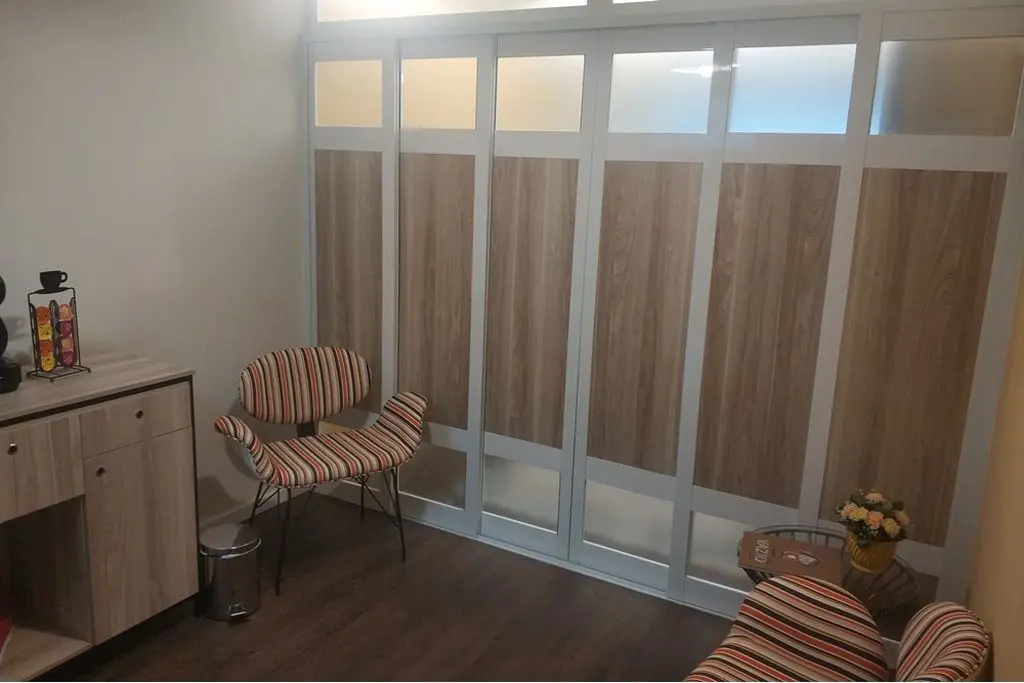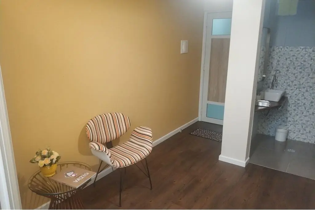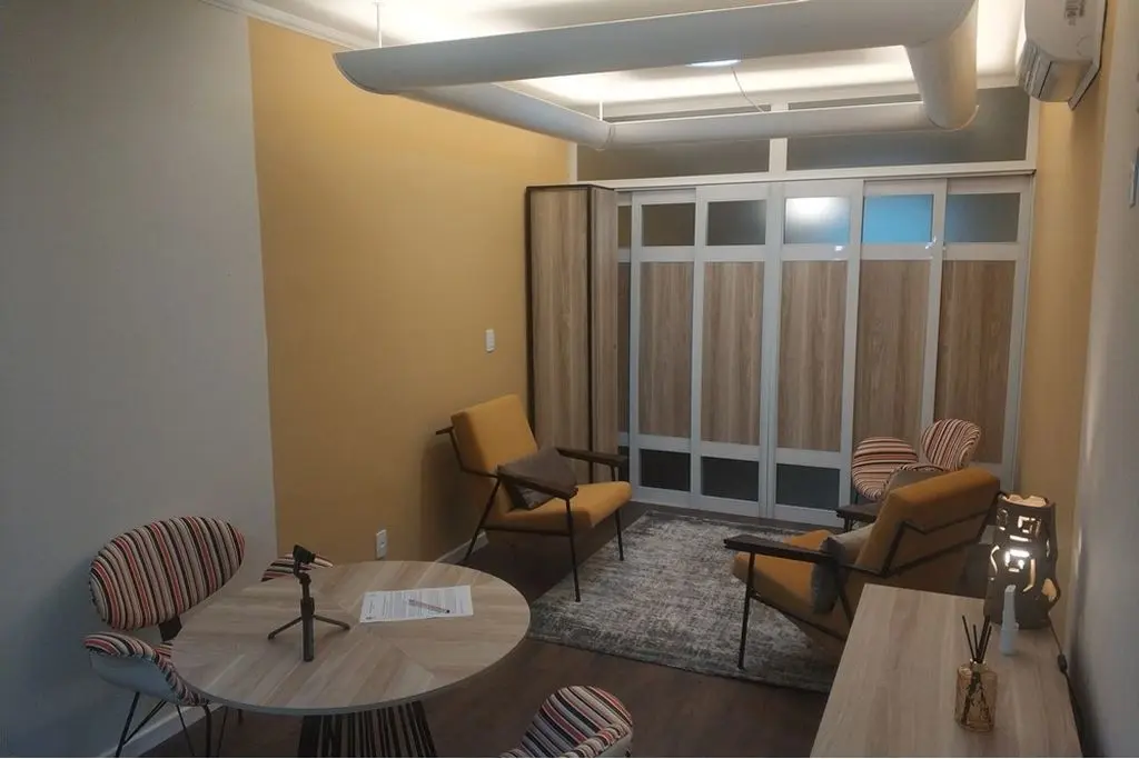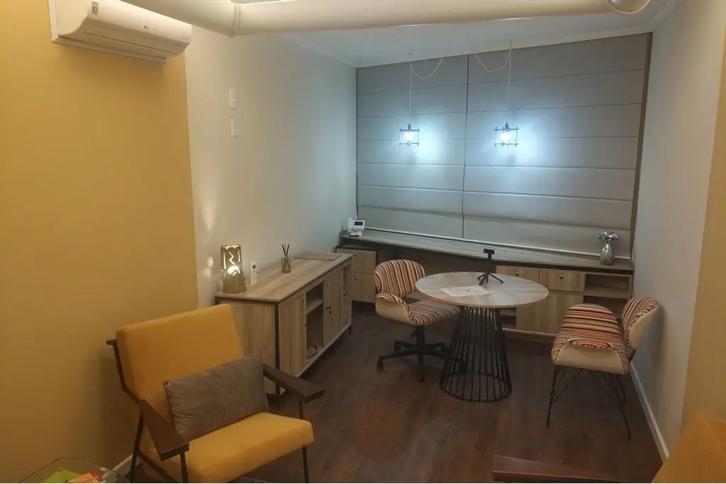 Piso vinílico, porta de correr em alumínio e madeira para divisão da sala em 2 ambientes ( recepção e sala de atendimento ), iluminação indireta, ar condicionado e vitrô grande.
