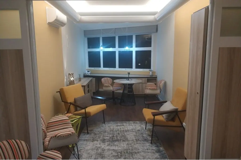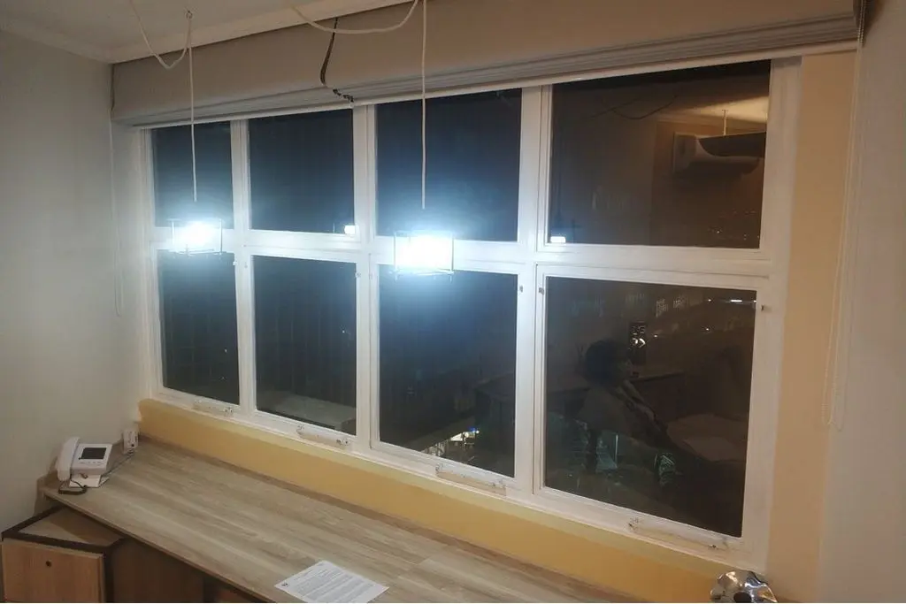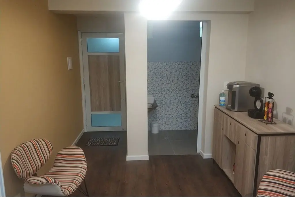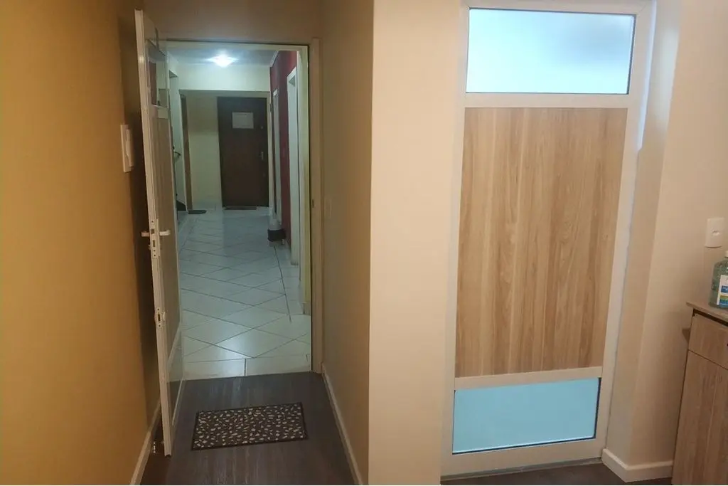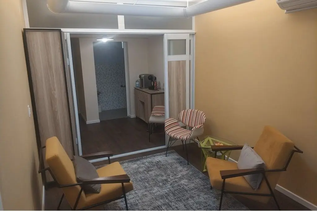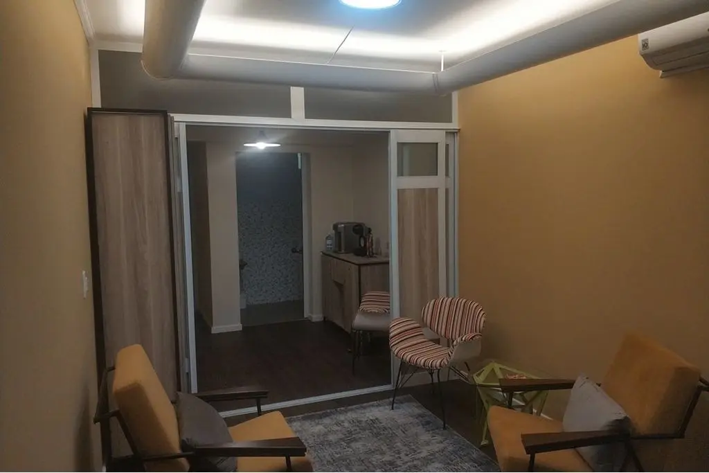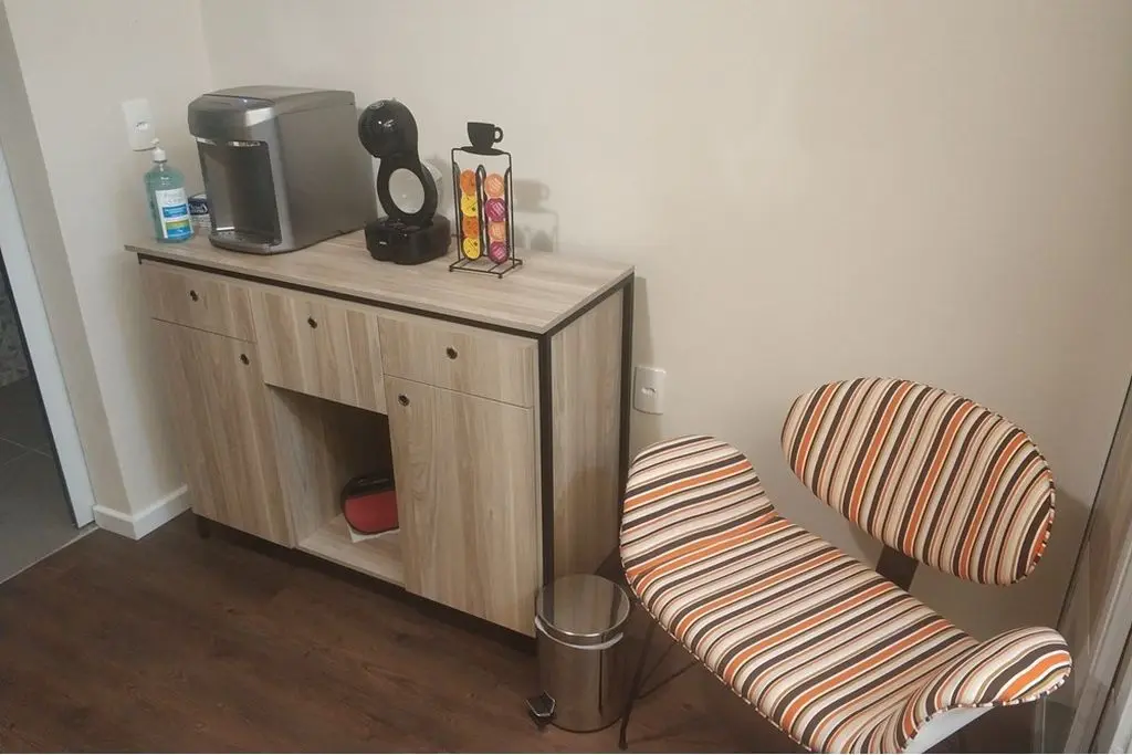 Piso vinílico, porta de correr em alumínio e madeira para divisão da sala em 2 ambientes ( recepção e sala de atendimento ), iluminação indireta, ar condicionado e vitrô grande.