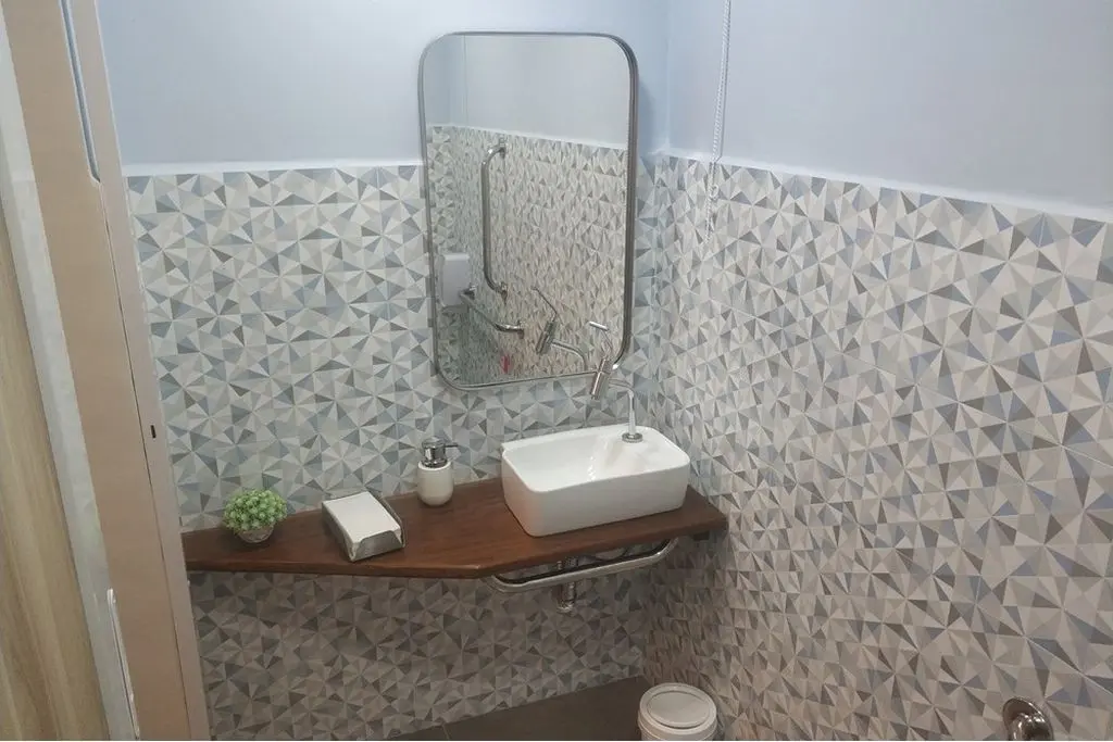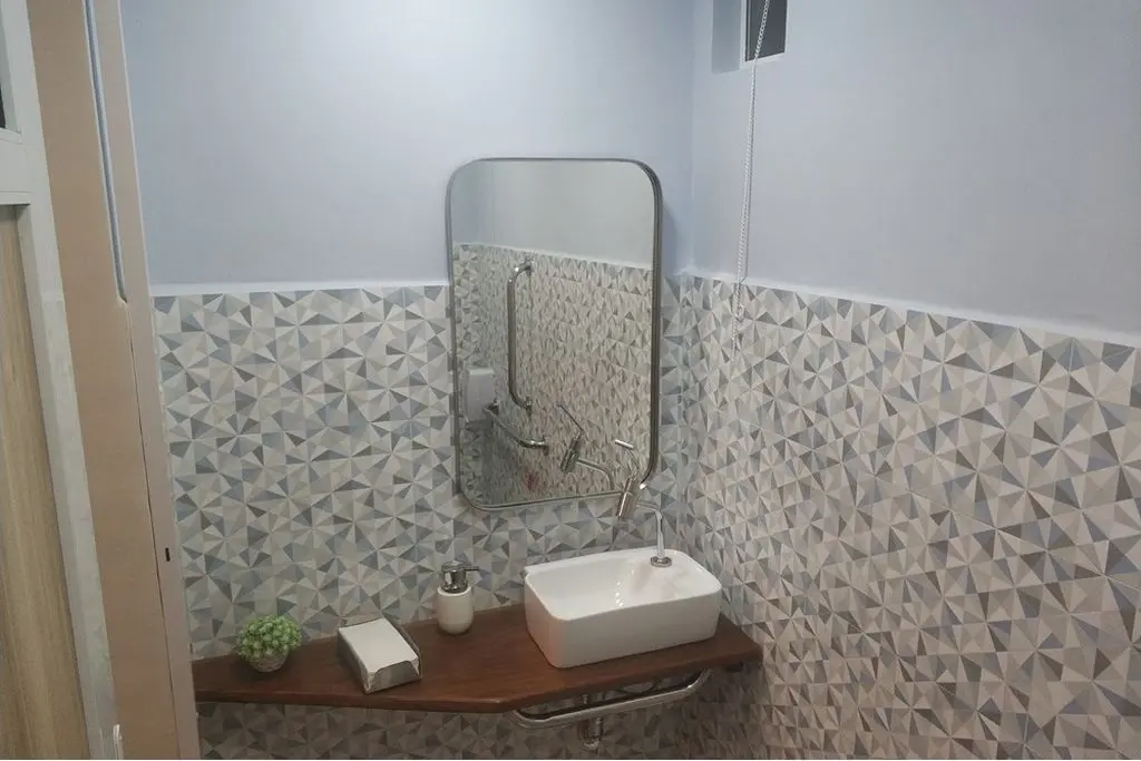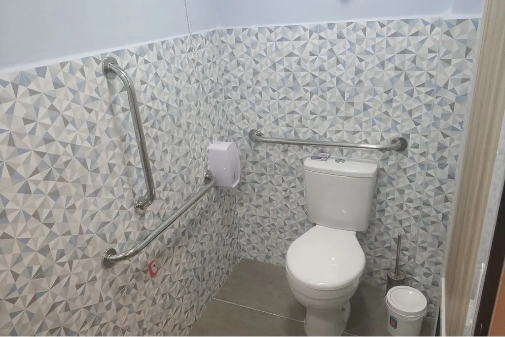 Banheiro acessível, com ventilação natural, adaptado para o uso de pessoas com necessidades especiais ou dificuldade de locomoção.