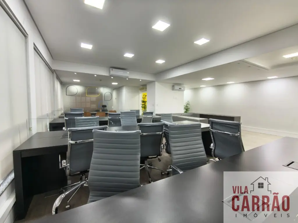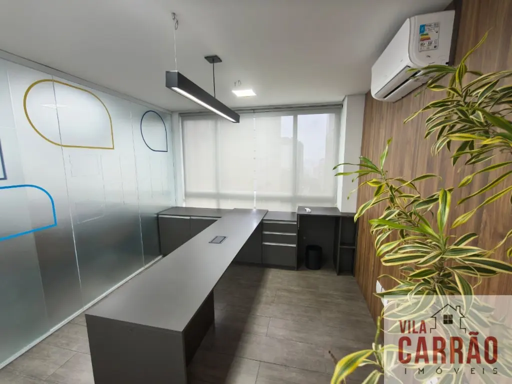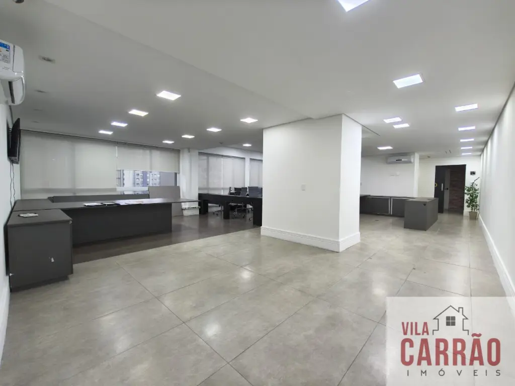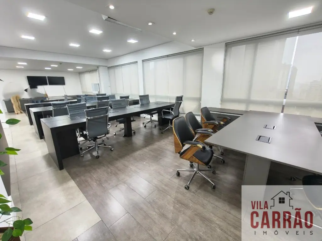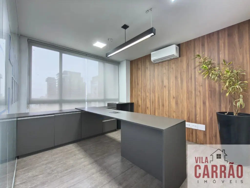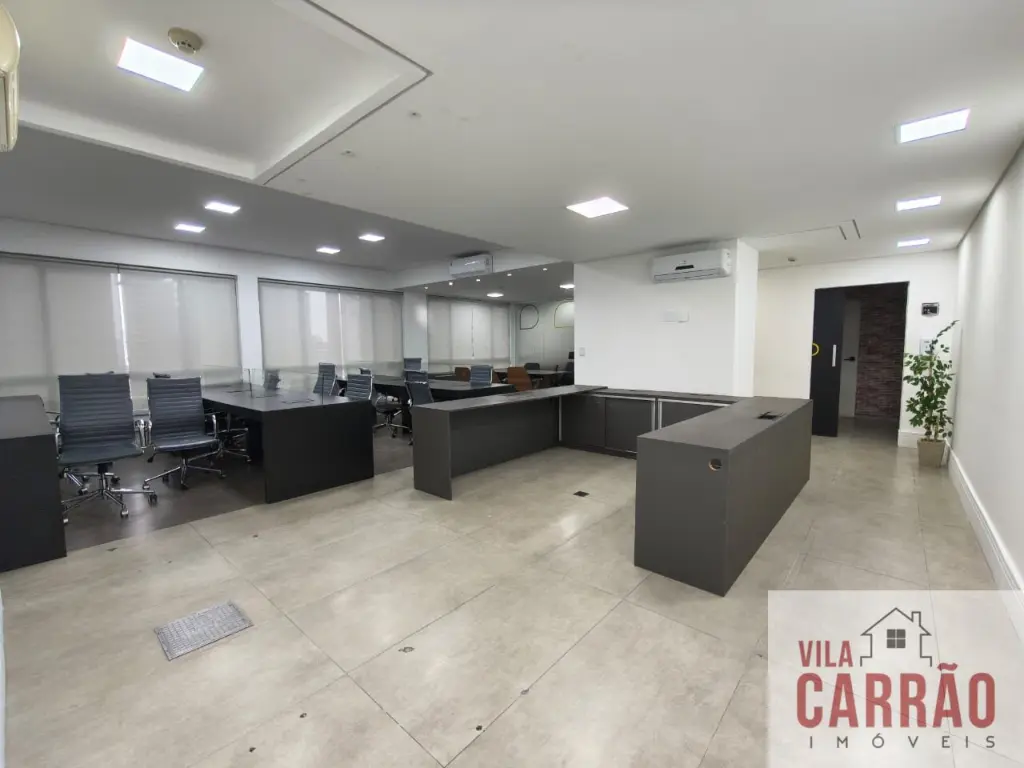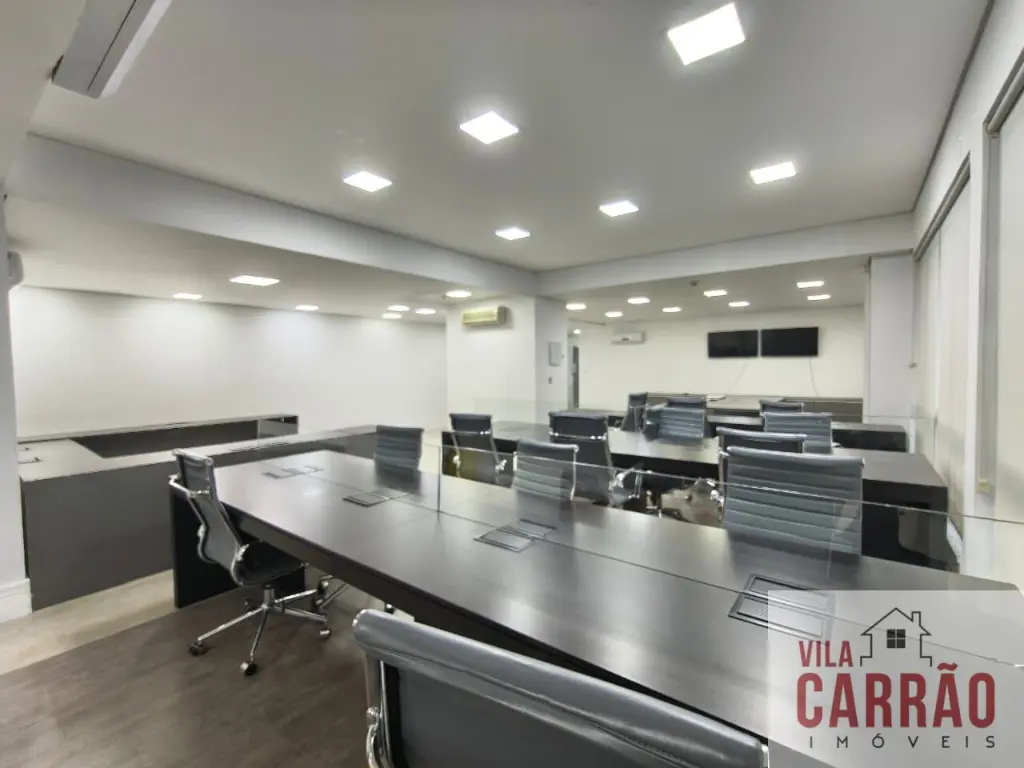 Sala montada, repleta de mobília, com mesas, armários e cadeiras, sala de diretoria com banheiro privativo, diversos aparelhos de ar-condicionado, 2 banheiros (feminino e masculino) para funcionários e copa.