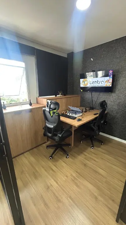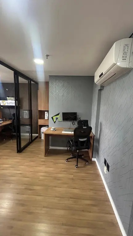 O imóvel conta ainda com banheiro privativo e ar-condicionado, proporcionando conforto no dia a dia. A disposição dos móveis foi pensada para otimizar o espaço e favorecer a produtividade da equipe.